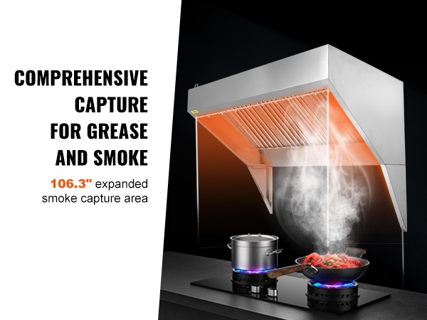 Noin 5FT (59") leveä savun keräysalue kerää tehokkaasti höyryn ja savun myös silloin, kun useita keittotasoja käytetään samaan aikaan. Tämä auttaa estämään savun leviämistä koko keittiöön ja parantaa työskentelyolosuhteita.