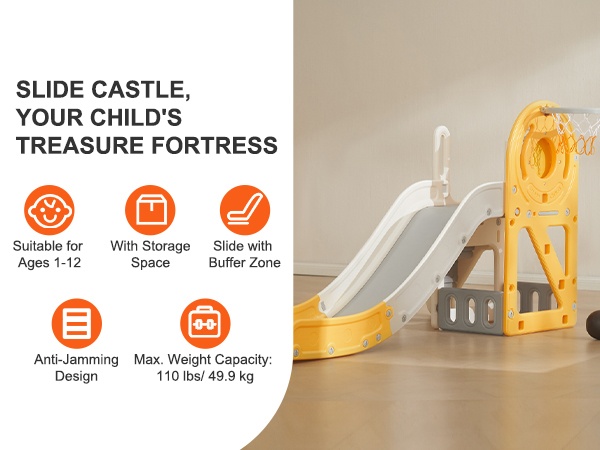 Liukumäki on valmistettu HDPE-muovista, ja siinä on pyöristetyt 360° reunat sekä liukumista estävät askelmat. Kolmiomainen rakenne pitää liukumäen tukevasti paikoillaan, jotta se ei pääse helposti kallistumaan tai kaatumaan käytössä. Mukana tulee myös korirengas ja koripallo, joten liukumäki tarjoaa monipuolisia leikkimahdollisuuksia.