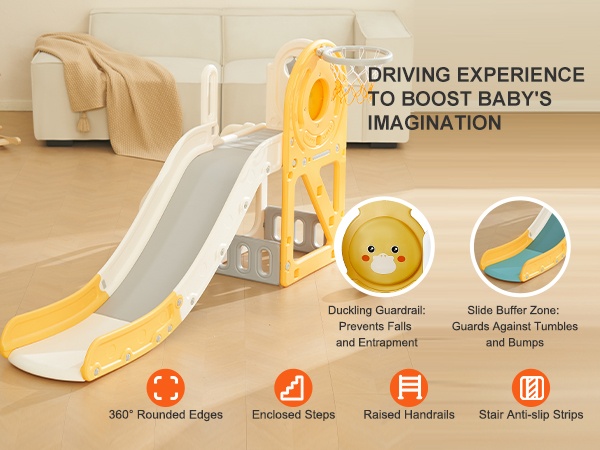 Lapsille suunnattu sisä- ja ulkokäyttöön sopiva liukumäki, jossa on kiipeiltävät portaat ja korotettu kaide. U-muotoinen, kaatumista estävä jalusta ja liukumäen lopussa oleva puskurialue auttavat suojaamaan lasta liu'un aikana. Kompakti koko tekee liukumäestä sopivan lastenhuoneeseen tai olohuoneeseen – pieneenkin tilaan saa luotua oman leikkipaikan.