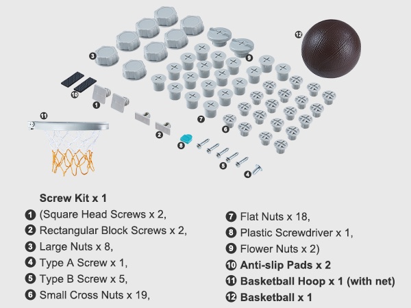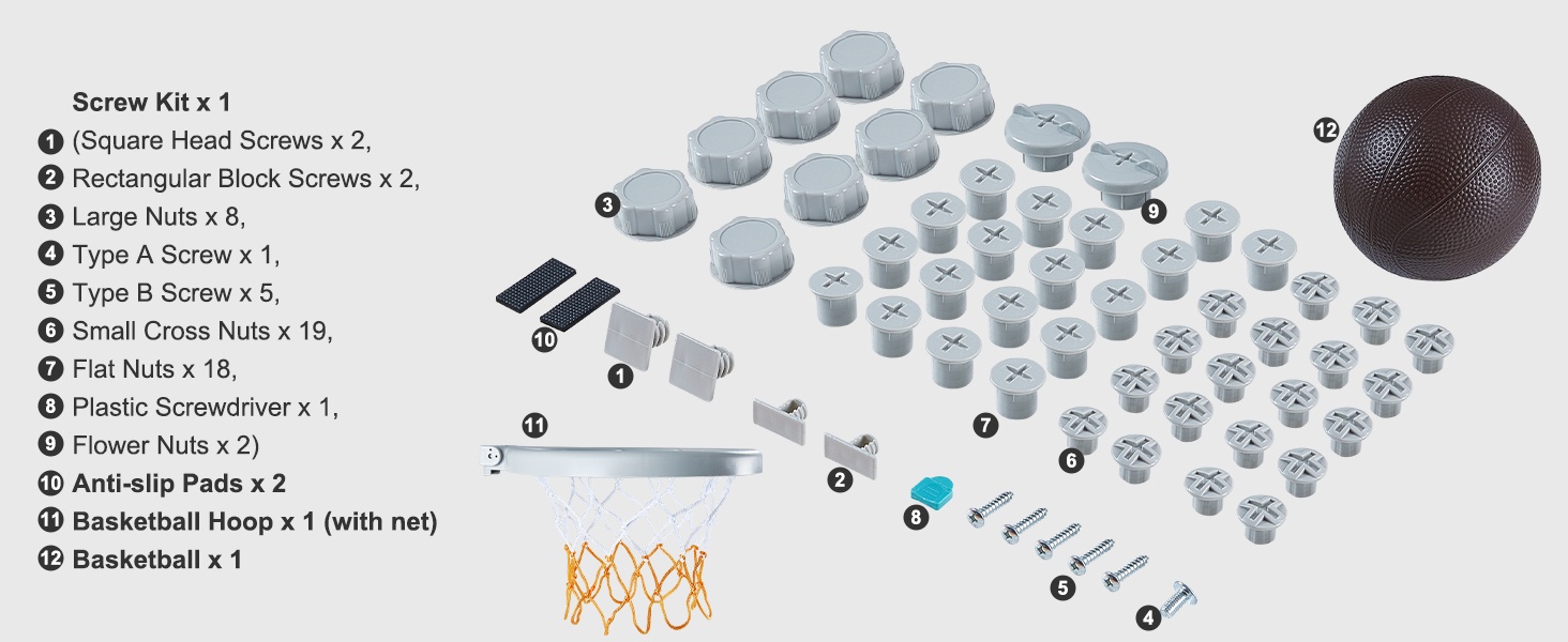 - Mukana asennustarvikkeet, ruuvit, ohjeet, korirengas ja koripallo