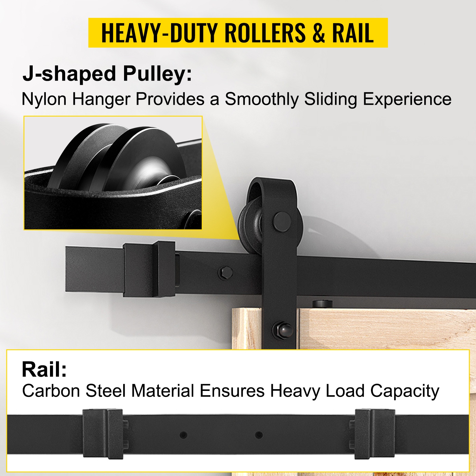 Nylonrullat vähentävät kitkaa, jolloin ovi liikkuu pehmeästi ja hiljaisesti. Vankka hiiliteräskisko pitää muotonsa kuormituksesta huolimatta eikä taivu helposti.
