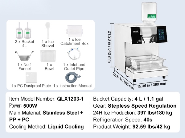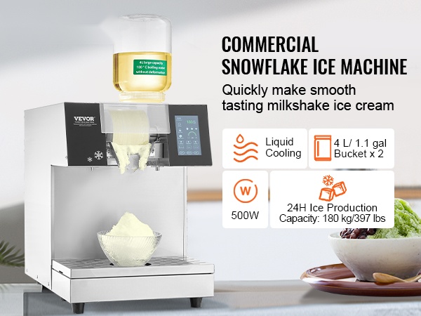 Tämä ilmalla jäähdytettävä lumihiutalejääkone on varustettu tehokkaalla 700W kompressorilla, joka saavuttaa nopean jäähdytyksen 40 sekunnissa. Koneessa on kaksi 4 L korillista, ja se tuottaa jopa 397 lbs / 180 kg jäätä 24 tunnissa. Sopii erilaisten pirtelöjäädykkeiden ja muiden kylmien juomien valmistukseen eri rakenteilla ja koostumuksilla.