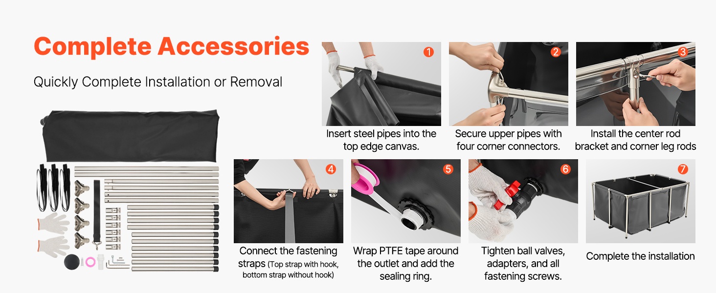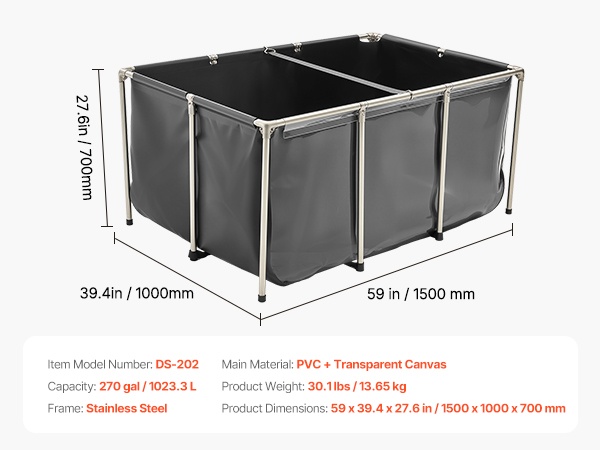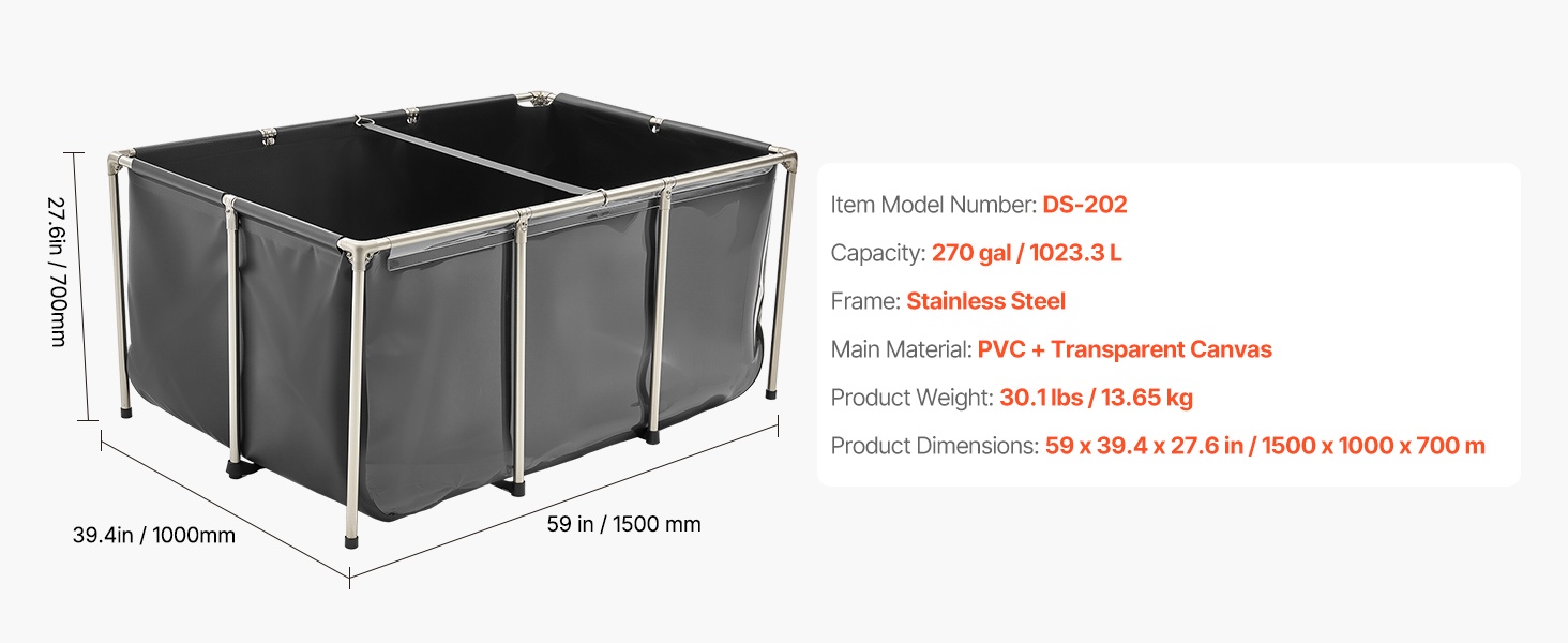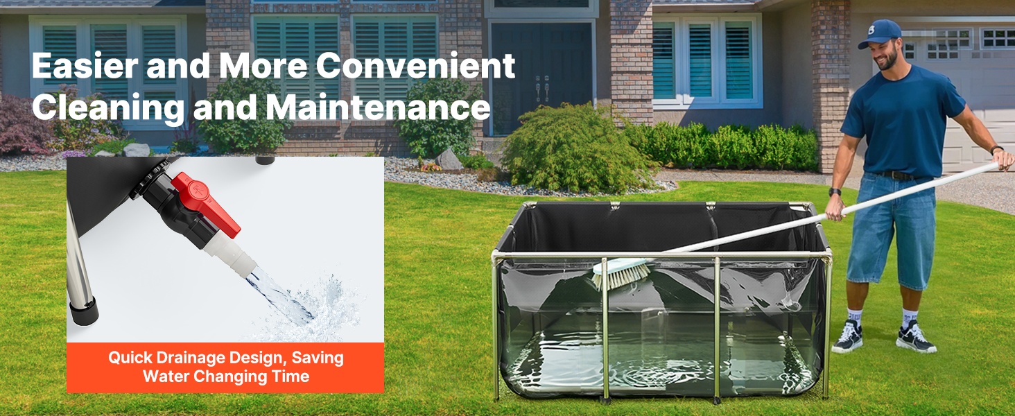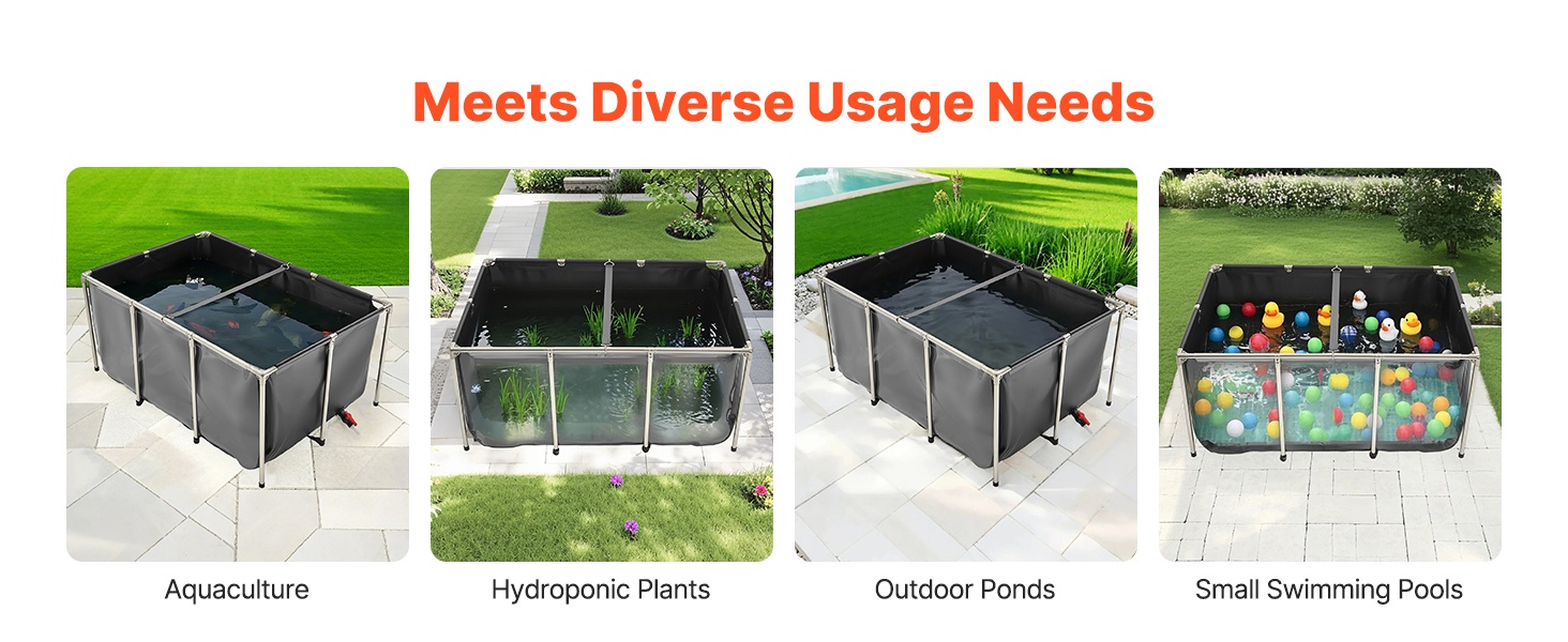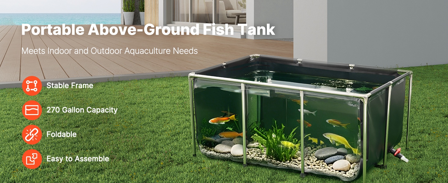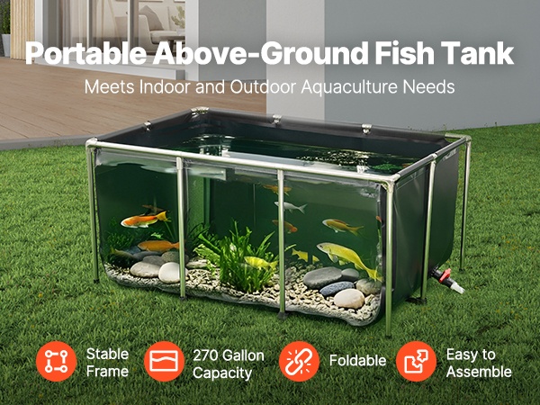Tukeva ja siirrettävä maanpäällinen kalapuutarha sopii sekä sisä- että ulkokäyttöön. Altaan paksu PVC-kangasmateriaali on kulutusta kestävää, ja tiivis rakenne ehkäisee vuotoja. Tilava 1320 gallonan / 5000 litran kapasiteetti tarjoaa runsaasti elintilaa esimerkiksi koikarpeille, kultakaloille, katkaravuille ja ravuille.