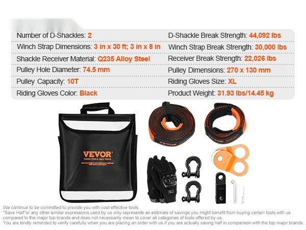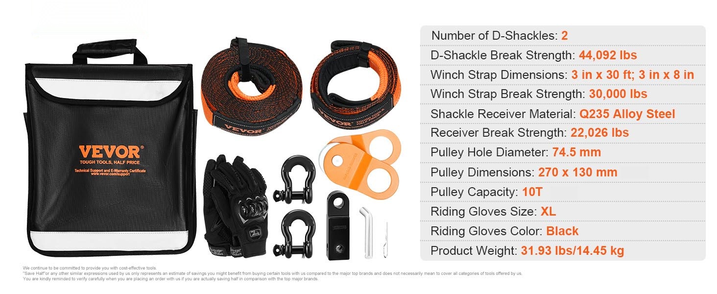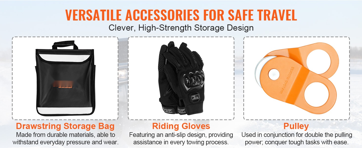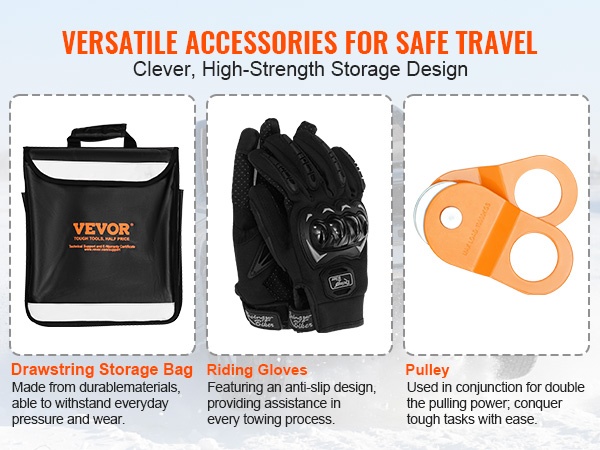Tämä maastoajoneuvojen talteenottosarja on suunniteltu helpottamaan jumittuneen ajoneuvon irrottamista mudasta, hiekasta tai lumesta. Kestävä hinausliina, vahvat D-rengassakkelit, väkipyörä, vetokoukun sovitin, ajohanskat ja säilytyslaukku muodostavat käytännöllisen kokonaisuuden esimerkiksi ATV-, Jeep- ja lava-autokäyttöön.
