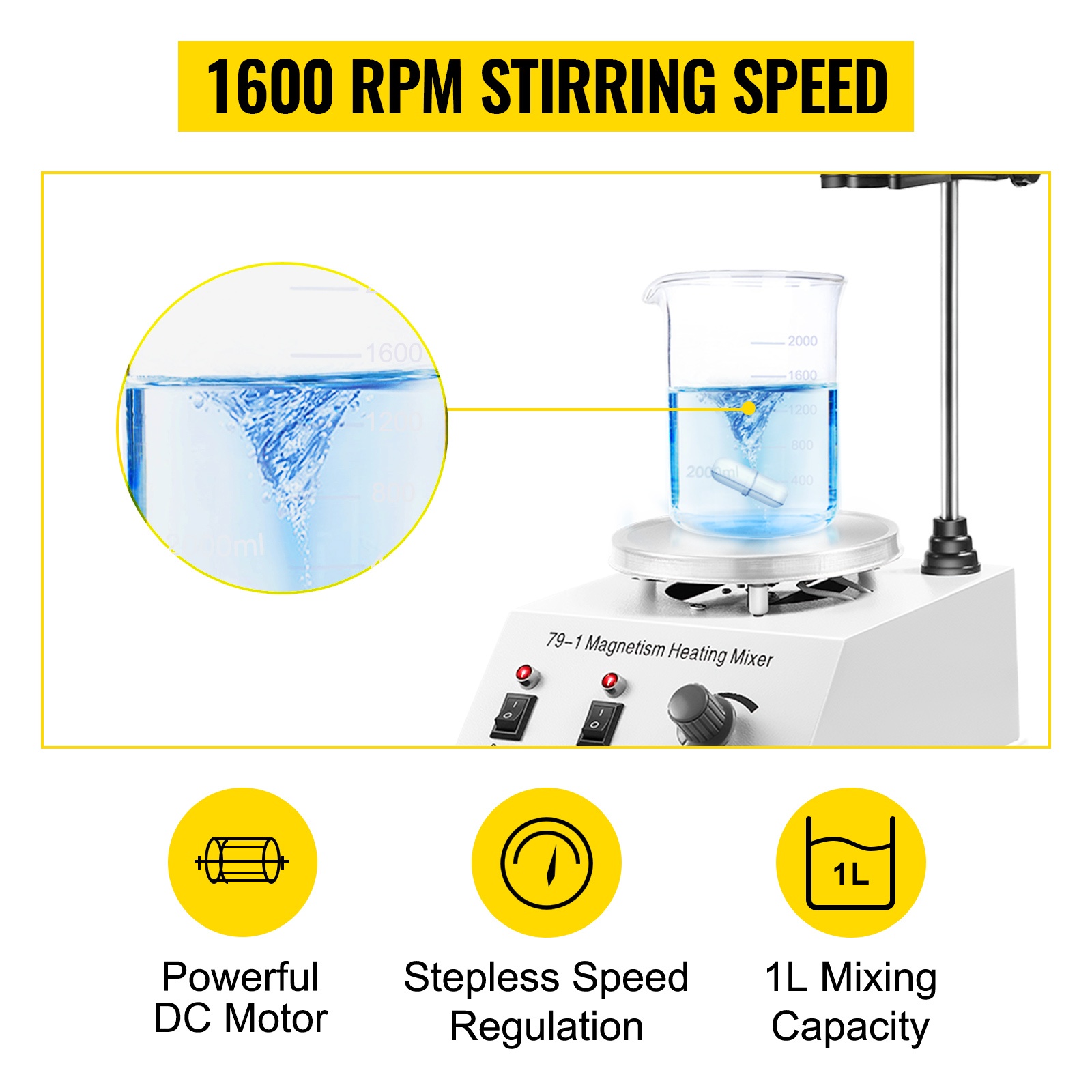 Tehokas tasavirtamoottori mahdollistaa säädettävän sekoitusnopeuden 0–2000 rpm. Enintään 1L sekoituskapasiteetti riittää myös suurempien nestemäärien käsittelyyn.
