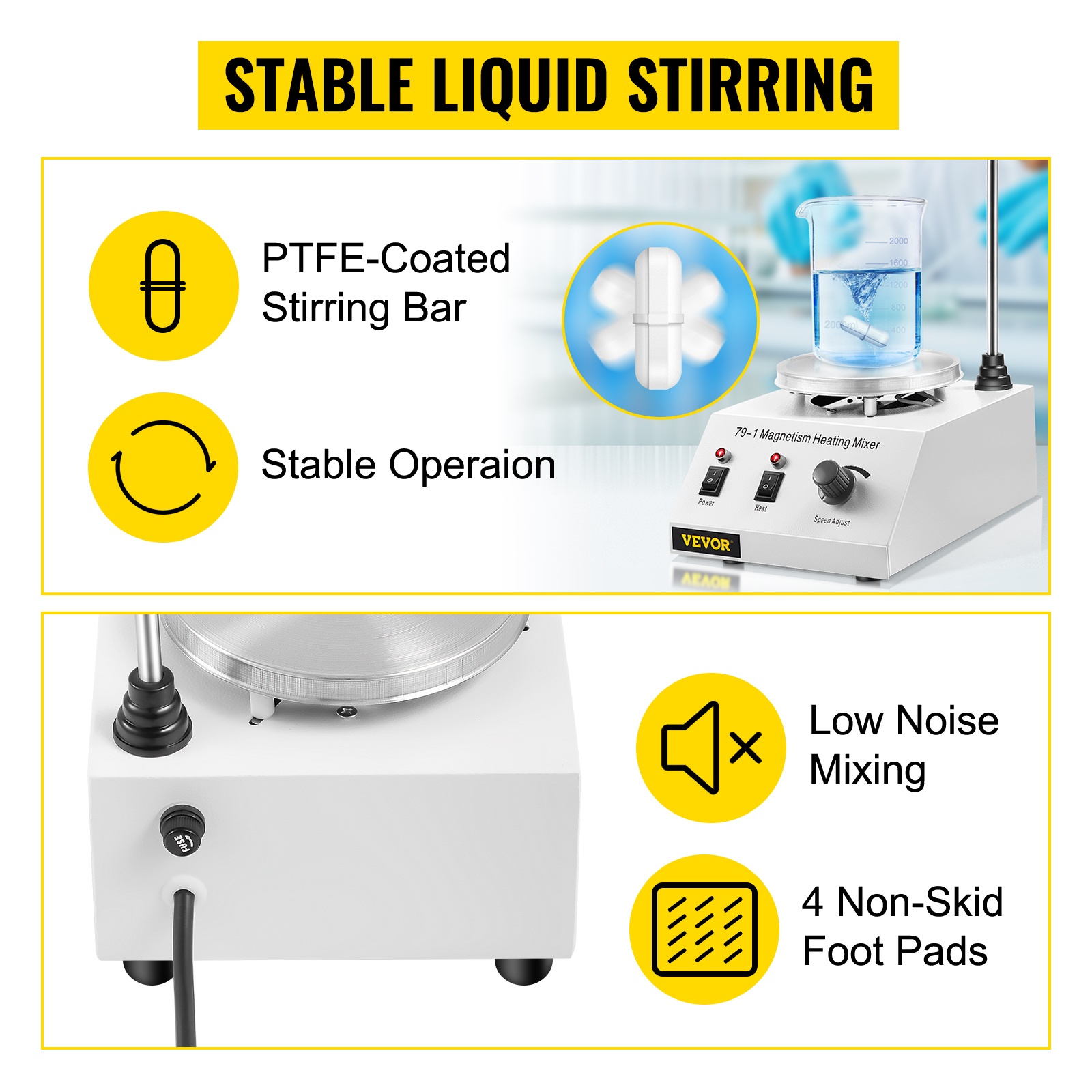 PTFE-pinnoitettu sekoitustanko sekoittaa nesteen vakaasti ja hiljaisesti myös täydellä nopeudella, eikä reagoi useimpien seosten kanssa. Neljä liukumista estävää jalkaa lisäävät laitteen vakautta käytön aikana.