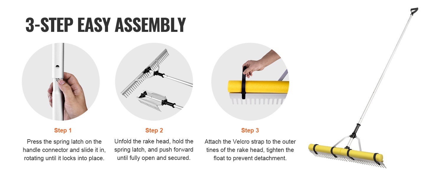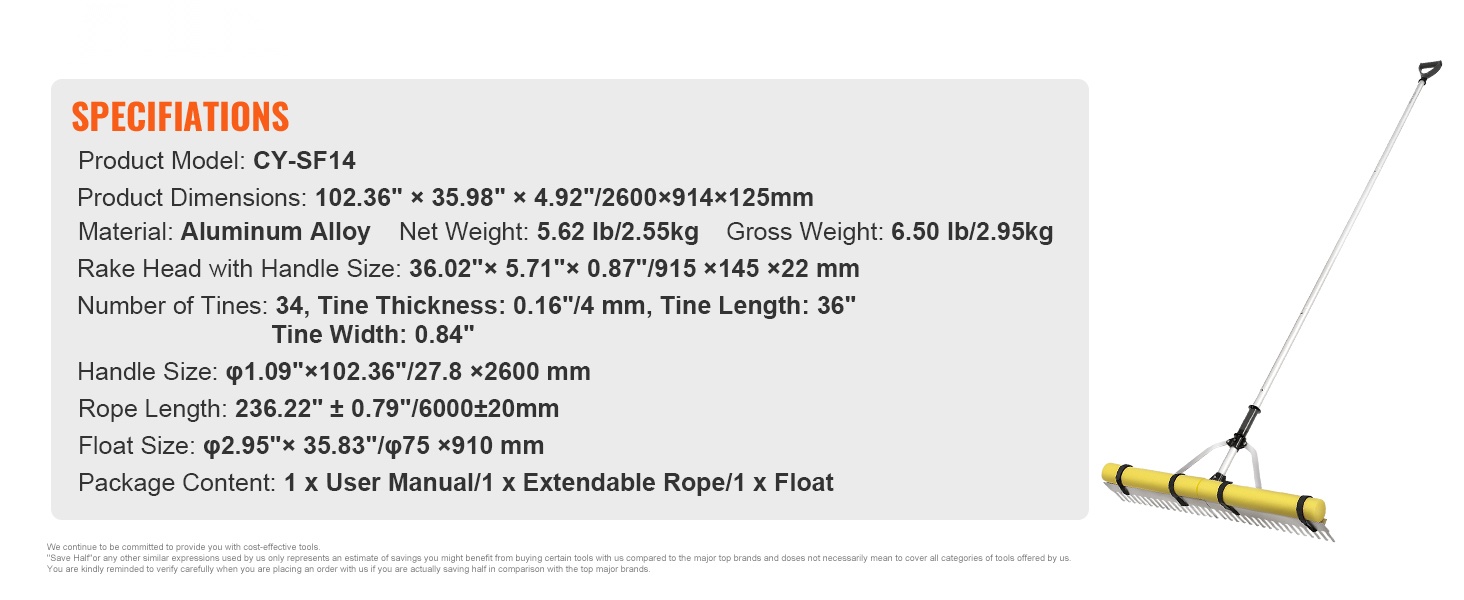 36" piikkipituuden, 0.31" piikkileveyden ja 34 piikin ansiosta järviharava kerää runsaasti roskaa yhdellä vedolla ja säästää aikaa sekä vaivaa. 102.36" liukumaton varsi vähentää tarpeetonta kumartelua ja kyykistymistä, joten laajojen alueiden puhdistus onnistuu helpommin.