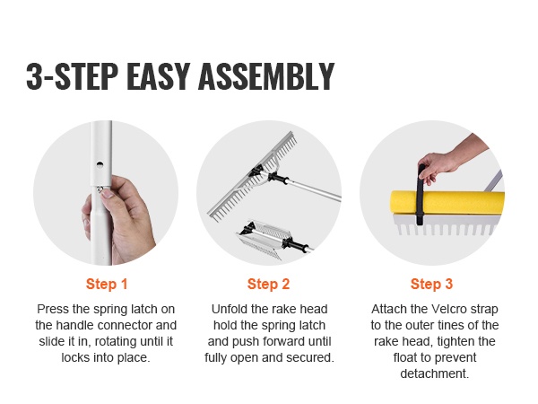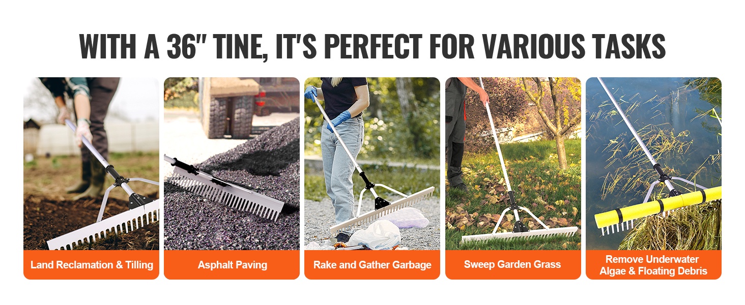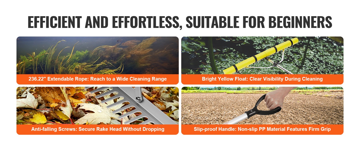 Tämä monikäyttöinen järviruokoharava on suunniteltu toimimaan hyvin sekä kuivalla maalla että vedessä. Sillä voi poistaa asfaltin reunoihin kertyneen roskan sekä siivota lampien ja uima-altaiden pinnalta roskat ja vesikasvit, jolloin puhdistustyö sujuu vaivattomasti.