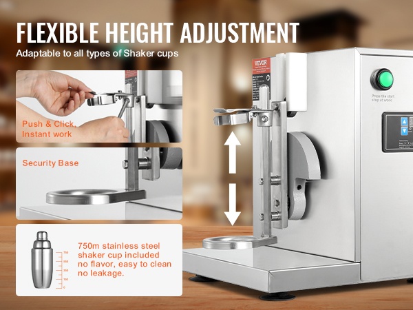 Shakerin korkeus on helppo säätää, joten se sopii sekä matalille mukeille että korkeille ravistuskipoille. Näin voit käyttää erilaisia astioita ilman erillisiä sovittimia.