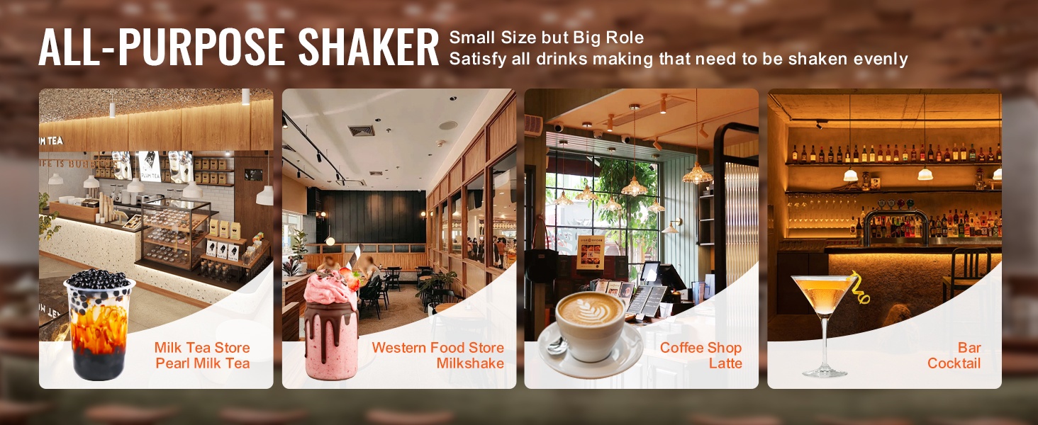 Laite sopii maitoteekahviloihin, ravintoloihin, kahviloihin ja baareihin. Sillä voi ravistaa esimerkiksi pearl milk tea -juomia, milkshakeja, lattejuomia ja cocktaileja.