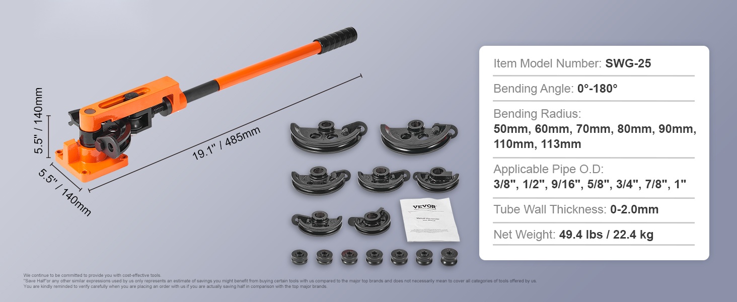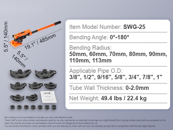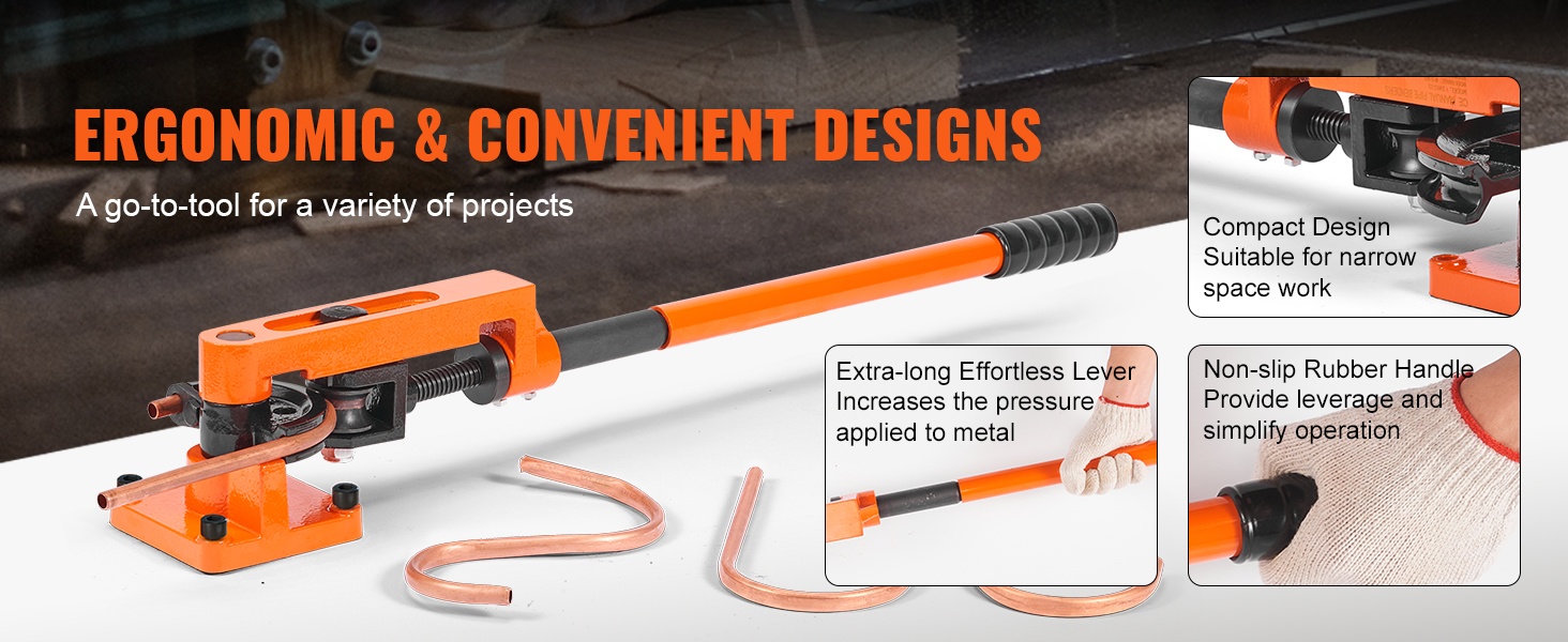 Tämä manuaalinen putkentaivutin on tarkoitettu kupari-, alumiini-, ohuiden teräs- ja ruostumattomien teräsputkien tarkkaan taivutukseen. Soveltuu putkille, joiden seinämän paksuus on 0–2mm ja ulkohalkaisija 9.5mm–25.4mm (3/8"–1"). Kompakti rakenne ja pitkä varsi helpottavat työskentelyä myös ahtaissa tiloissa.