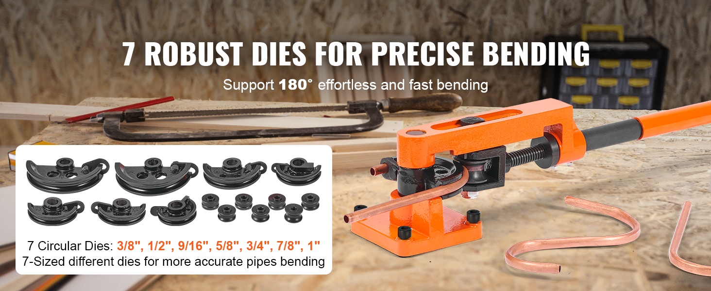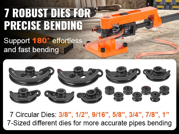 7 mukana tulevaa taivutussapluunaa on suunniteltu eri halkaisijojen putkille. Koot 3/8", 1/2", 9/16", 5/8", 3/4", 7/8" ja 1" tarjoavat joustavuutta erilaisten taivutuskulmien toteuttamiseen tarkasti.