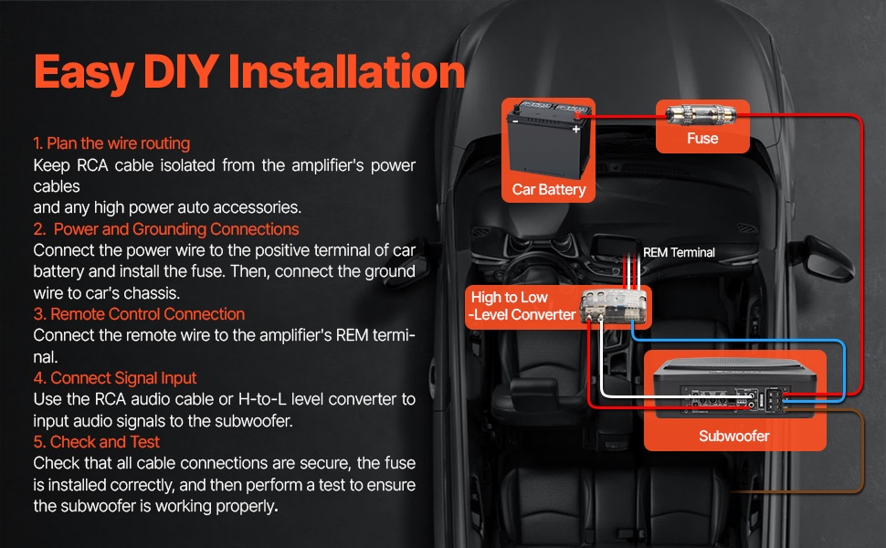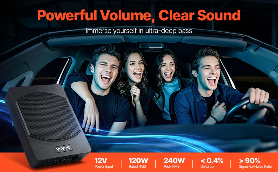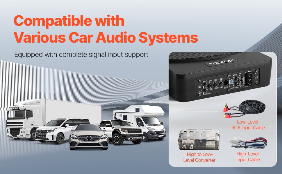 Subwoofer sopii useimpiin ajoneuvotyyppeihin, kuten autoihin, katumaastureihin, lava-autoihin ja matkailuautoihin. Liitä se auton äänijärjestelmään RCA-äänikaapelilla tai korkeatasoisella kaiutinsisäänmenokaapelilla, jolloin se toimii sekä yksinkertaisempien että kehittyneempien soittimien kanssa.