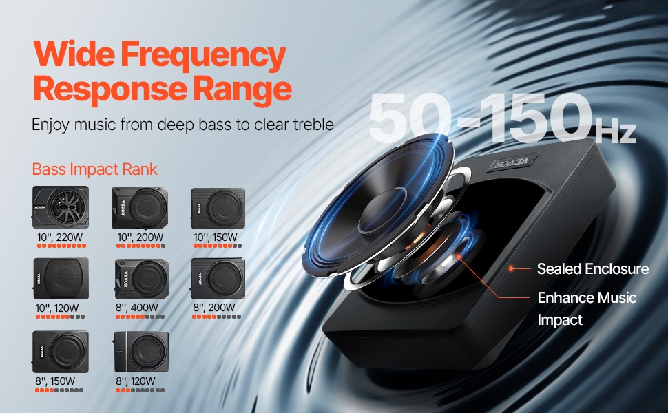 Taajuusvaste 50–150 Hz tuo esiin musiikin matalat taajuudet tasapainoisesti. Riippumatta siitä, kuunteletko R&B:tä, hip-hopia, EDM:ää vai rockia, subwoofer lisää kappaleisiin iskevää rytmiä ja voimakasta bassoa.