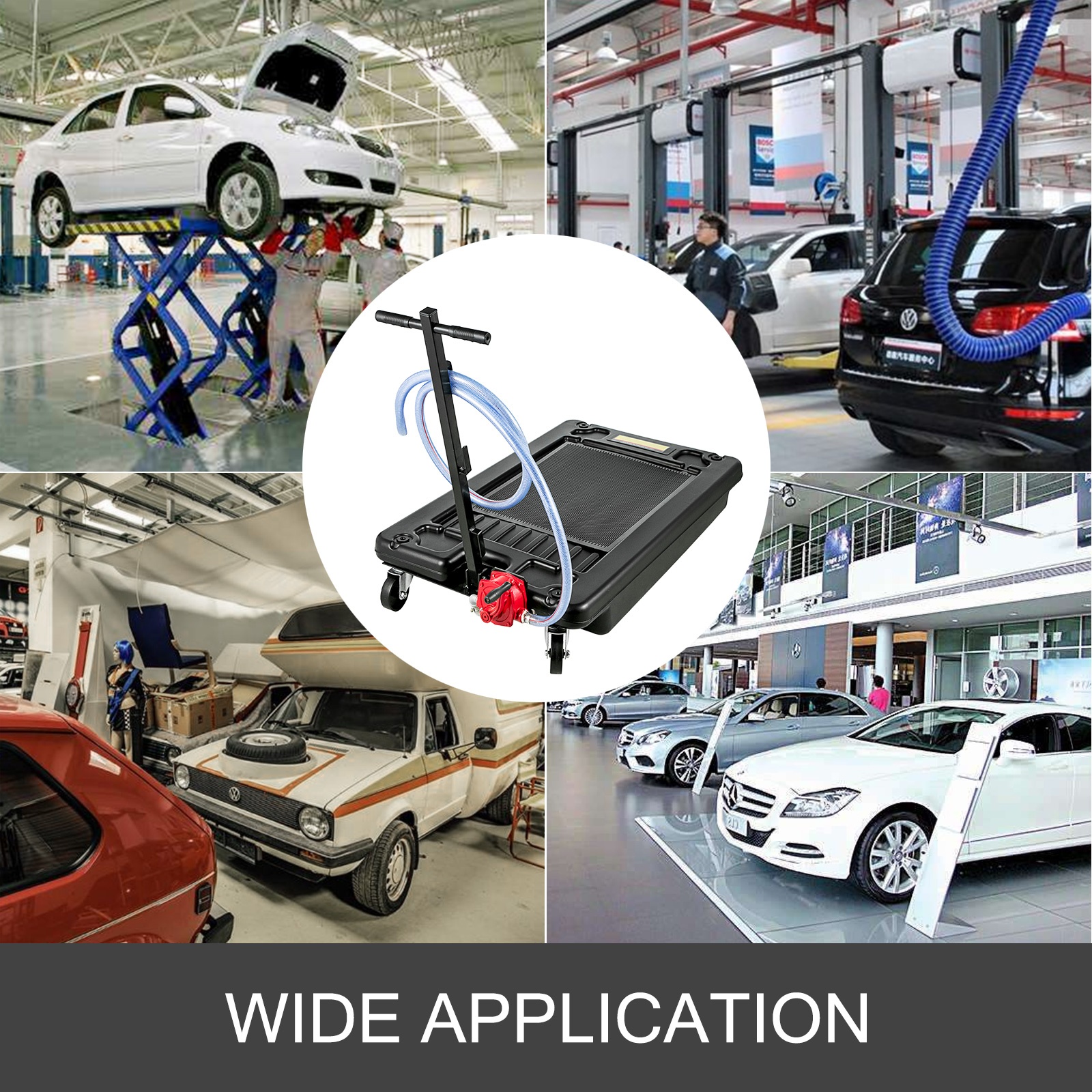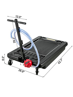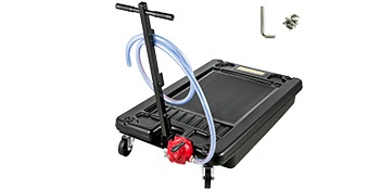 Tämä matalaprofiilinen öljynkeräysastia on suunniteltu öljyn ja jäähdytysnesteen tyhjentämiseen erityisesti autojen, SUV-mallien ja kuorma-autojen alta silloin, kun nosturia tai monttua ei ole käytettävissä. Iskunkestävä polypropeenirunko on kevyt, ruostumaton ja korroosionkestävä. Kokoontaitettava T-kahva ja neljä kääntyvää pyörää helpottavat siirtämistä ja säilytystä. Mukana tuleva 8' / 244 cm tyhjennysletku helpottaa nesteen siirtämistä keräysastiasta eteenpäin.