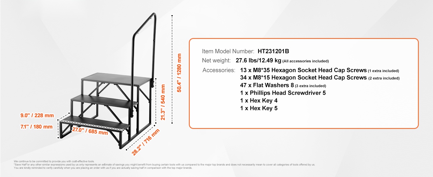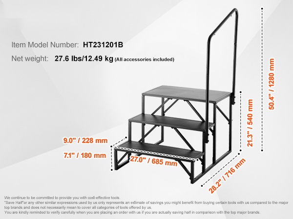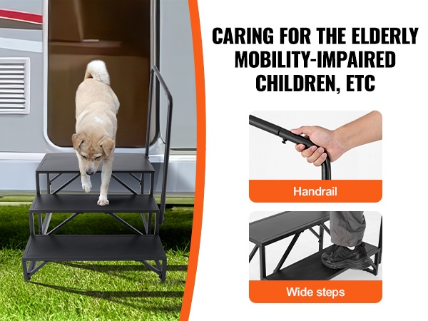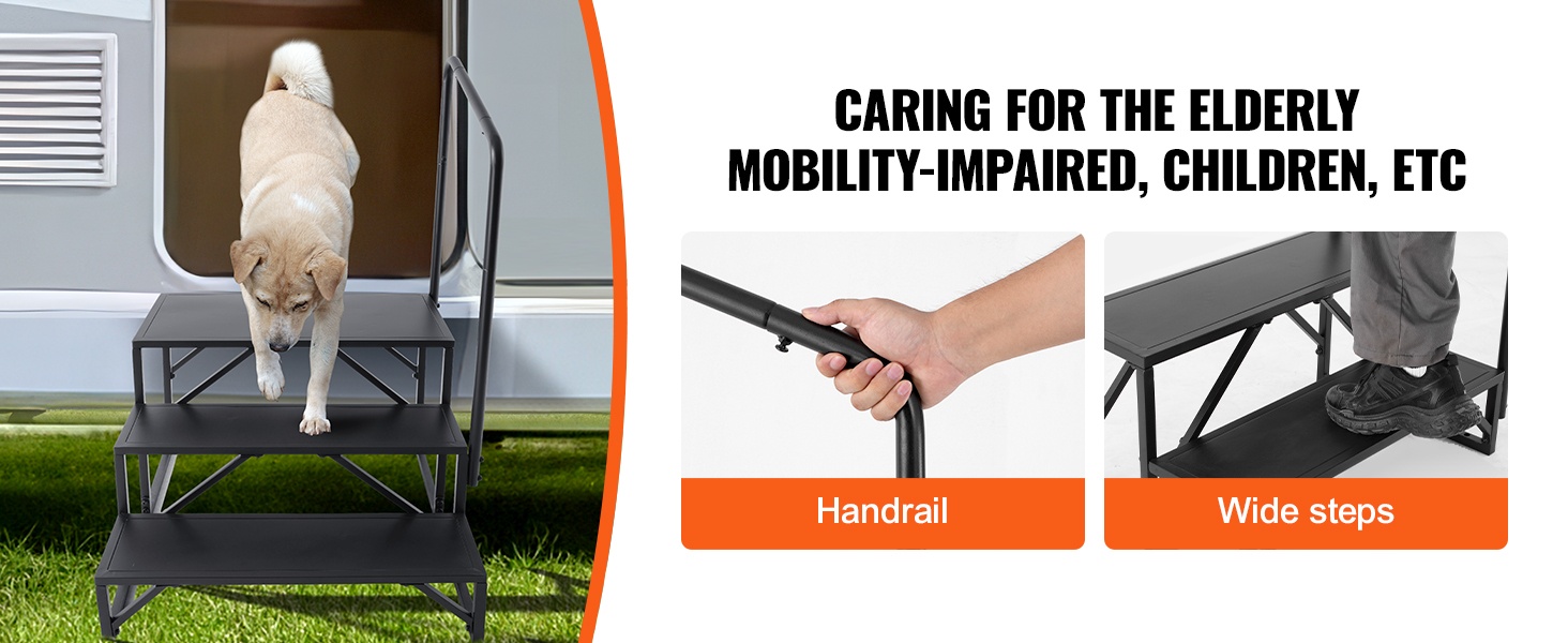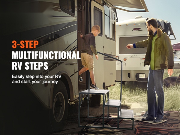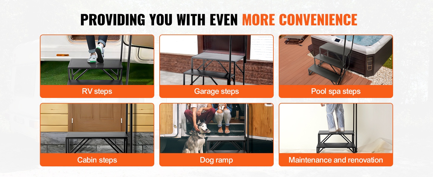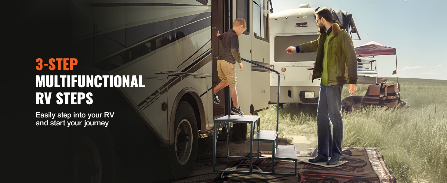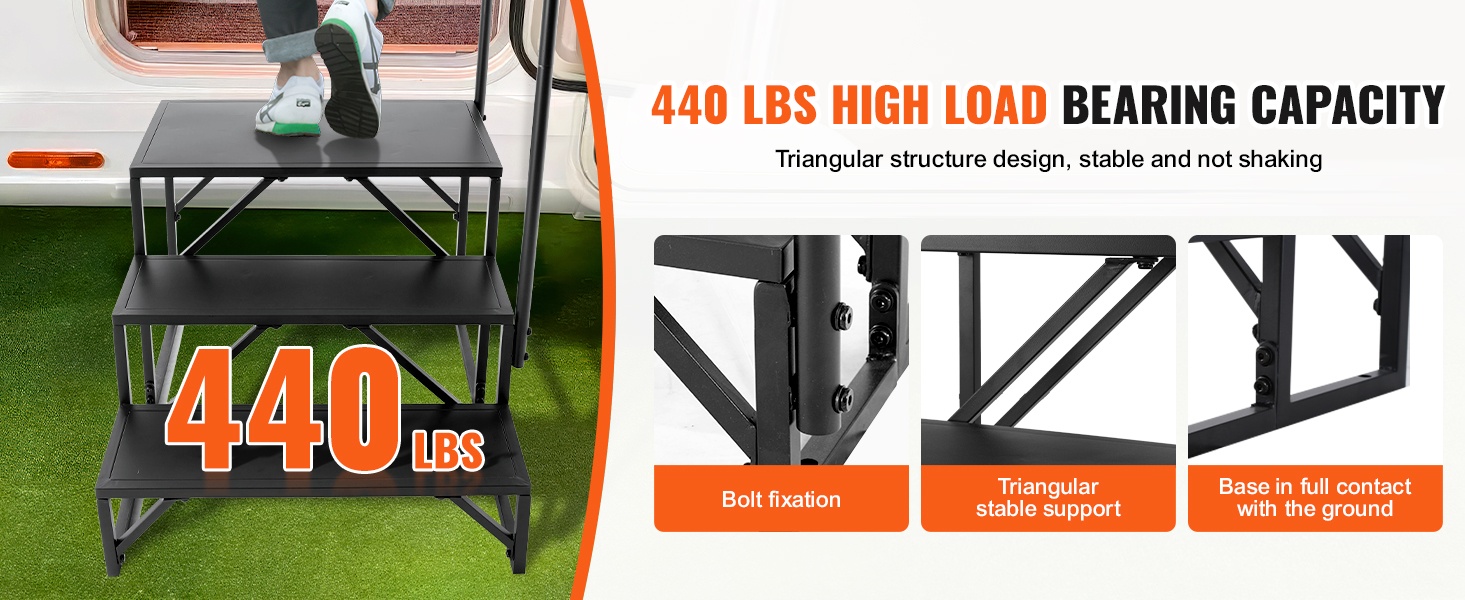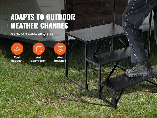 Näiden 2-portaisten askelmien avulla nousu ja laskeutuminen matkailuautoon on vakaata ja turvallista. Vahva teräsrakenne kantaa jopa 440 lbs / 199.6 kg, joten askelmia voi käyttää yhtä aikaa kaksi aikuista. Sopii matkailuauton, perävaunun ja retkeilyauton ovelle sekä esimerkiksi mökin tai varaston portaisiin.
