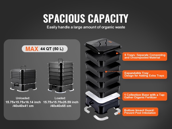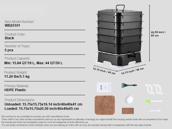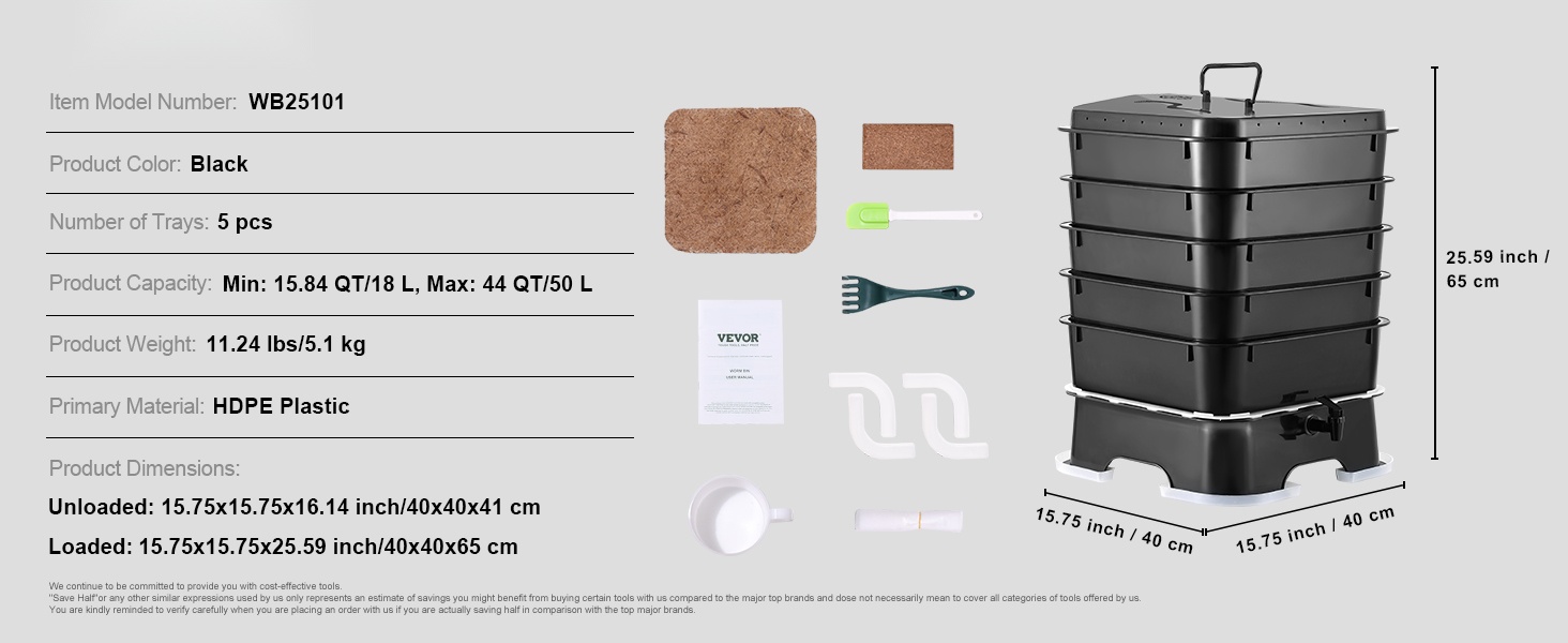 Matokompostorin tilavuus on 44 QT/50 L, ja siinä on 5 kerrosta sekä pohjasäiliö hanalla nesteen keräämistä varten. Laajennettavan rakenteen ansiosta voit lisätä tarvittaessa lisää kerroksia. Pohjamatto auttaa pitämään muurahaiset ja hyttyset poissa. Settiin mahtuu tuhansia matoja, ja se pystyy käsittelemään useita paunoja jätettä viikoittain.
