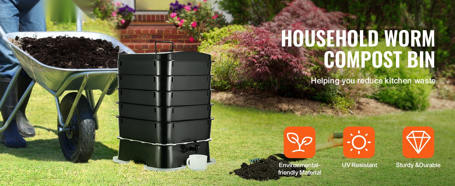 Tämä matokompostori on valmistettu HDPE-muovista, joka on vahvaa ja kestävää. Materiaali on kierrätettävää ja uudelleenkäytettävää, joten se vähentää muovijätteen määrää. Korkean lujuuden, kulutuskestävyyden ja korroosionkestävyyden ansiosta kompostori kestää pitkään ilman, että se helposti rikkoutuu tai vääntyy.
