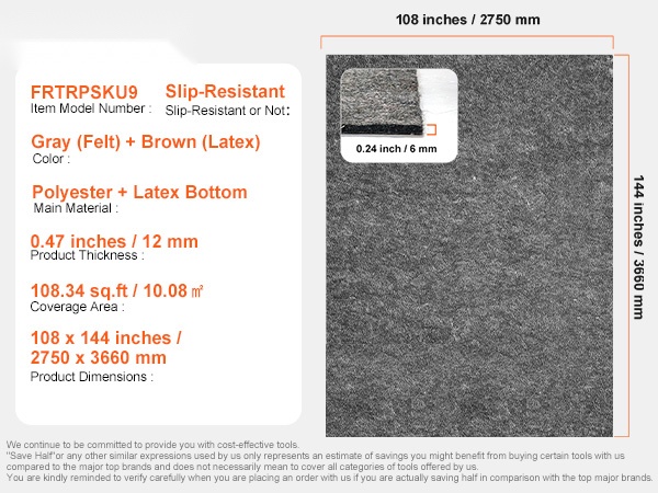 Tämä liukuestepohjainen mattoalusta tekee matosta pehmeämmän ja miellyttävämmän astua, suojaa lattiaa ja auttaa pitämään maton tukevasti paikallaan. Koko 9' x 12' (noin 10–11㎡) sopii hyvin olohuoneeseen, ruokailutilaan, makuuhuoneeseen ja muihin kodin tiloihin.