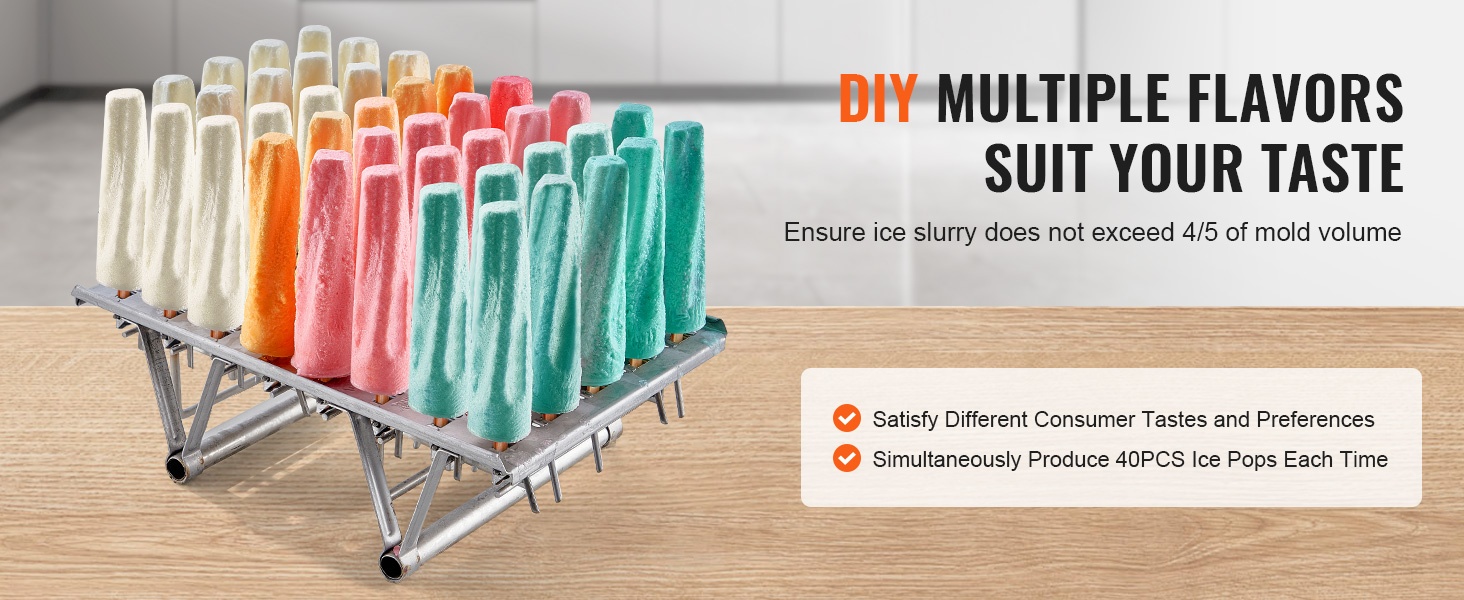 Voit valmistaa itse erilaisia mehujäitä eri makuyhdistelmillä. Varmista, että mehujääseos ei ylitä 4/5 muotin tilavuudesta. Koko setillä voit valmistaa samanaikaisesti 40 mehujäätä, jolloin erikokoisten asiakasryhmien tarpeet on helppo täyttää.