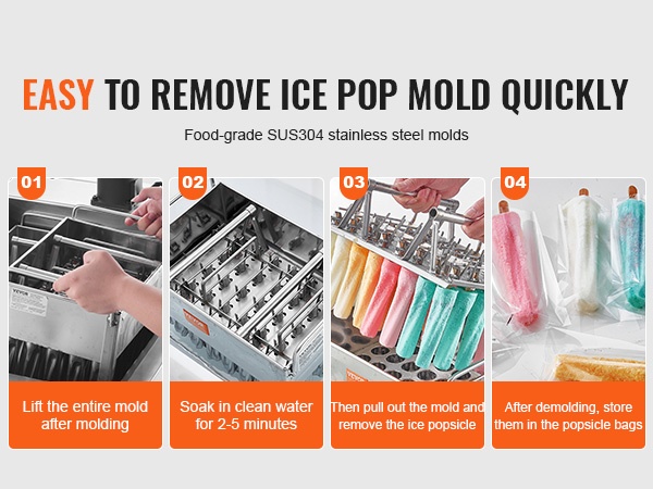 SUS304-ruostumattomasta teräksestä valmistetut muotit helpottavat mehujään irrotusta. Nosta koko muotti pakastimesta, liota sitä puhtaassa vedessä 2–5 minuuttia, vedä muotti ylös ja irrota mehujäät. Irrotuksen jälkeen mehujäät voi pakata mukana tuleviin mehujääpusseihin säilytystä ja tarjoilua varten.
