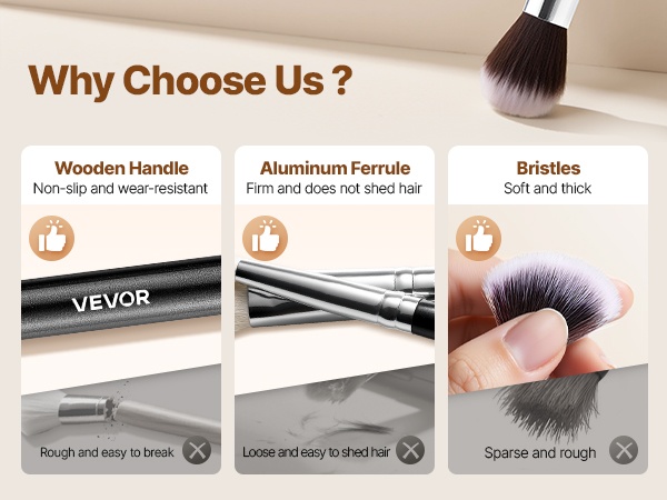 Siveltimissä on pitävä, kestävä puinen varsi, joka istuu hyvin käteen. Tukeva alumiininen holkki lukitsee harjakset paikalleen ehkäisten irtoamista. Pehmeät ja tiheät harjakset levittävät tuotteet tasaisesti ilman raitoja.