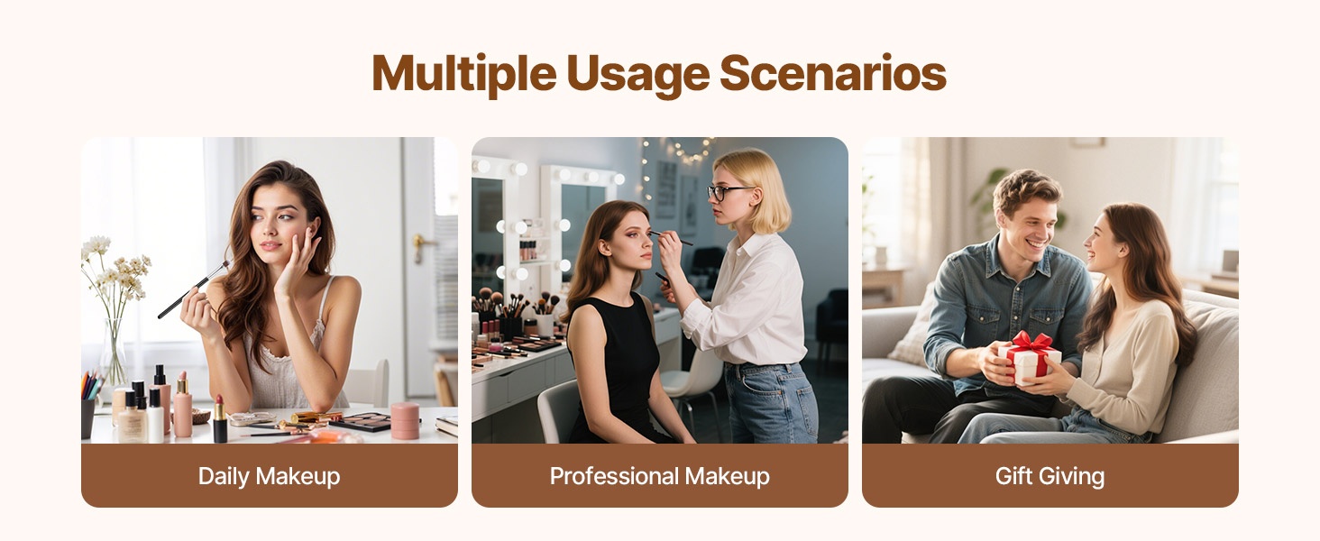 Setti sopii päivittäiseen käyttöön, ammattimaiseen meikkaukseen sekä harkituksi lahjaksi. Monipuolinen kokoonpano, selkeä rakenne ja laadukkaat materiaalit tekevät siitä käytännöllisen lisän jokaisen meikkipussiin.