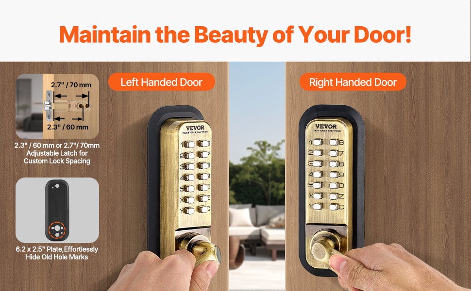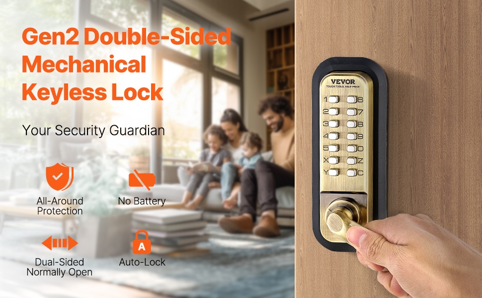 Tämä 2. sukupolven mekaaninen avaimeton ovilukko ei tarvitse paristoja eikä johtoja. Ovi lukittuu automaattisesti sen sulkeutuessa, mikä parantaa murtosuojausta. Koodin asettaminen tai vaihtaminen onnistuu helposti tavallisella ruuvimeisselillä, joten lukon käyttö on vaivatonta ja luotettavaa.
