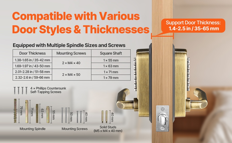 Mekaaninen näppäimistölukko sopii oviin, joiden paksuus on 1.4–2.5 in / 35–65 mm. Mukana tulee useita kara- ja ruuvisarjoja, jotta voit valita oman ovityyppisi mukaan sopivat asennustarvikkeet. Tämä lisää joustavuutta ja helpottaa asennusta eri ovirakenteisiin.
