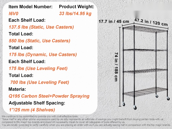 - Yhden hyllyn kantavuus: 400 lbs/181.4 kg