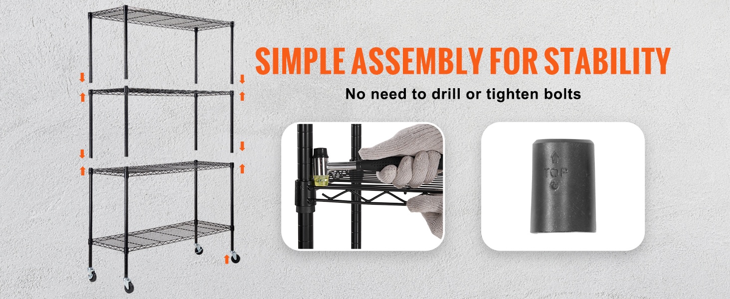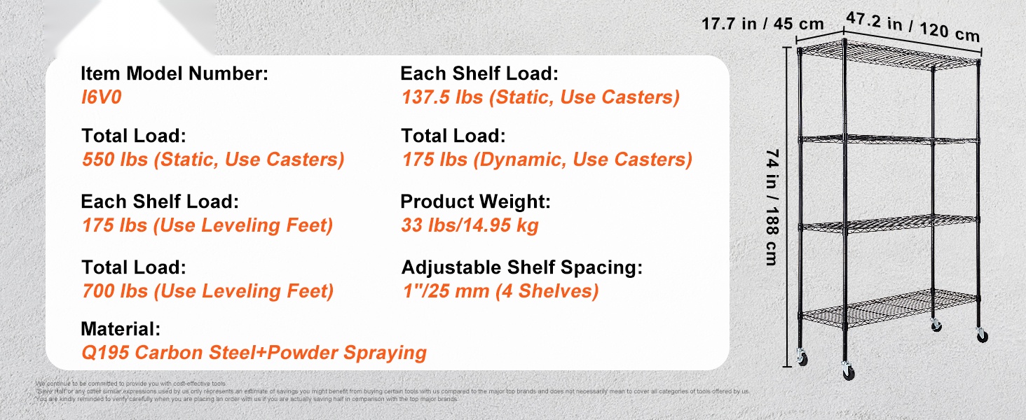 Jokainen raskaan käytön hylly on suunniteltu kestämään jopa 400 lbs/181.4 kg. Vahvistettu rakenne auttaa pitämään hyllyn vakaana ja vähentää heilumista myös täyteen kuormattuna.