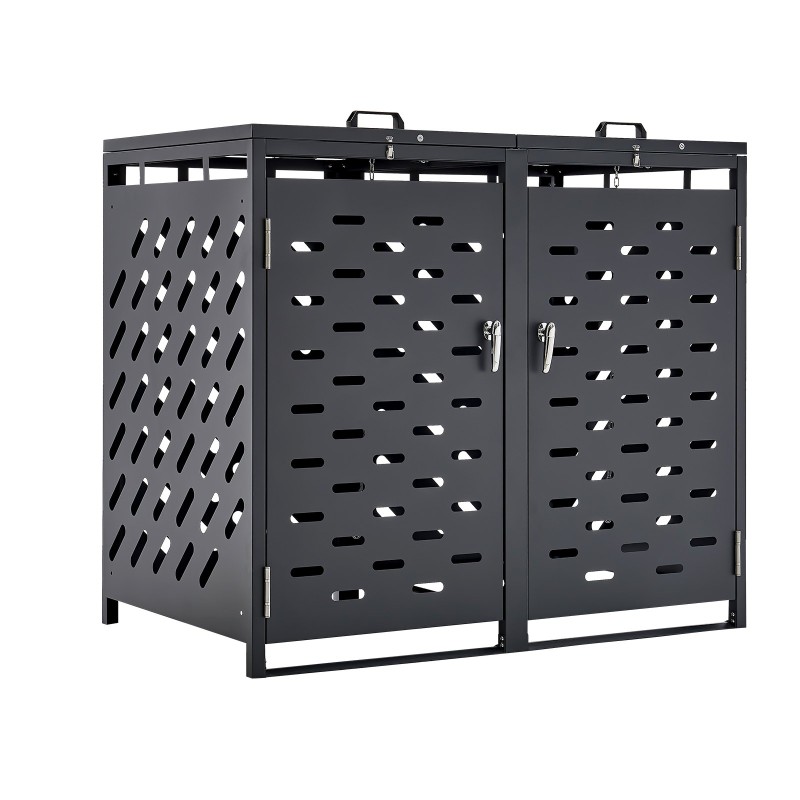 Metallinen jäteastiasuoja tarjoaa siistin ja huomaamattoman paikan kahdelle jäteastialle. Kestävä sinkitty teräs ja jauhemaalattu pinta suojaavat roska-astioita säältä ja eläimiltä sekä auttavat pitämään pihan, puutarhan ja terassin siistinä.