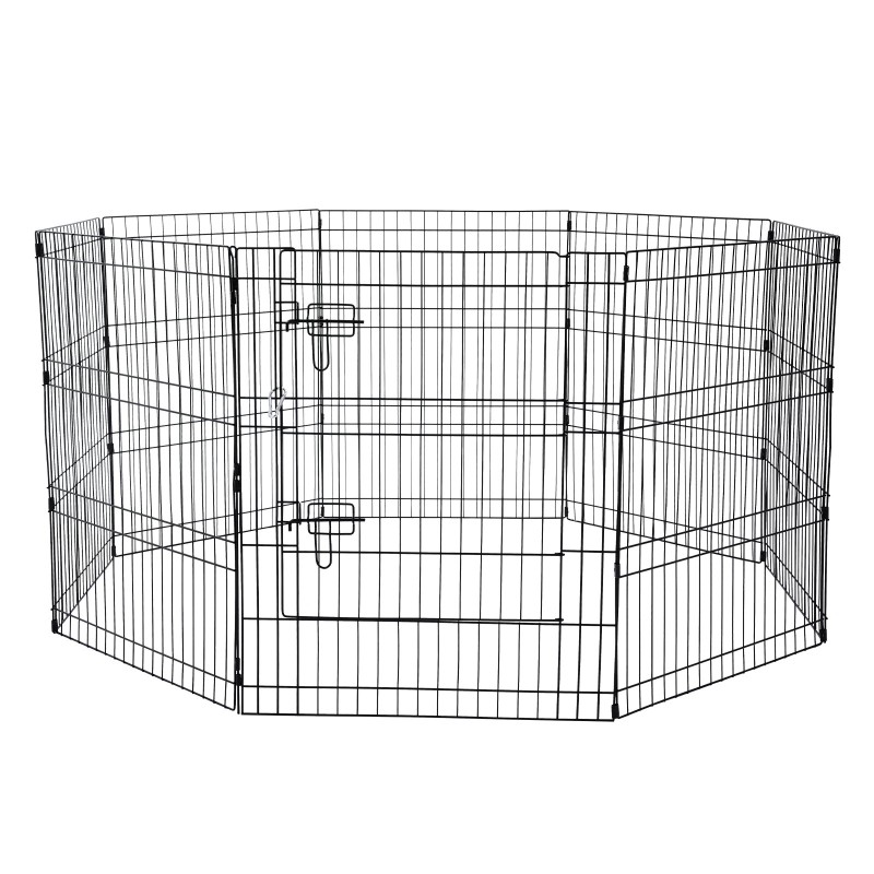 Metallinen leikkiaita tarjoaa koiralle, kissalle tai muille pienille lemmikeille oman, turvallisen tilan sekä sisällä että ulkona. Aita saavuttaa suurimman tilan, kun paneelit asetellaan kahdeksankulmion muotoon. Yläosa voidaan avata vetoketjulla, jotta omistajan on helppo päästä lemmikin luo, mikä tekee aitauksesta käytännöllisen sekä arjen käyttöön että koulutukseen.