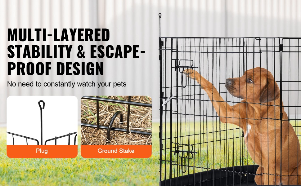 Leikkikehä on ankkuroitavissa maahan tukevasti, mikä estää sen liukumista tai kaatumista. Portissa on lukot, joita lemmikit eivät saa itse avattua. Vankka metallirakenne kestää pureskelua ja suojaa aitaa vaurioitumiselta, jolloin lemmikin voi jättää aidan sisälle huolettomammin.