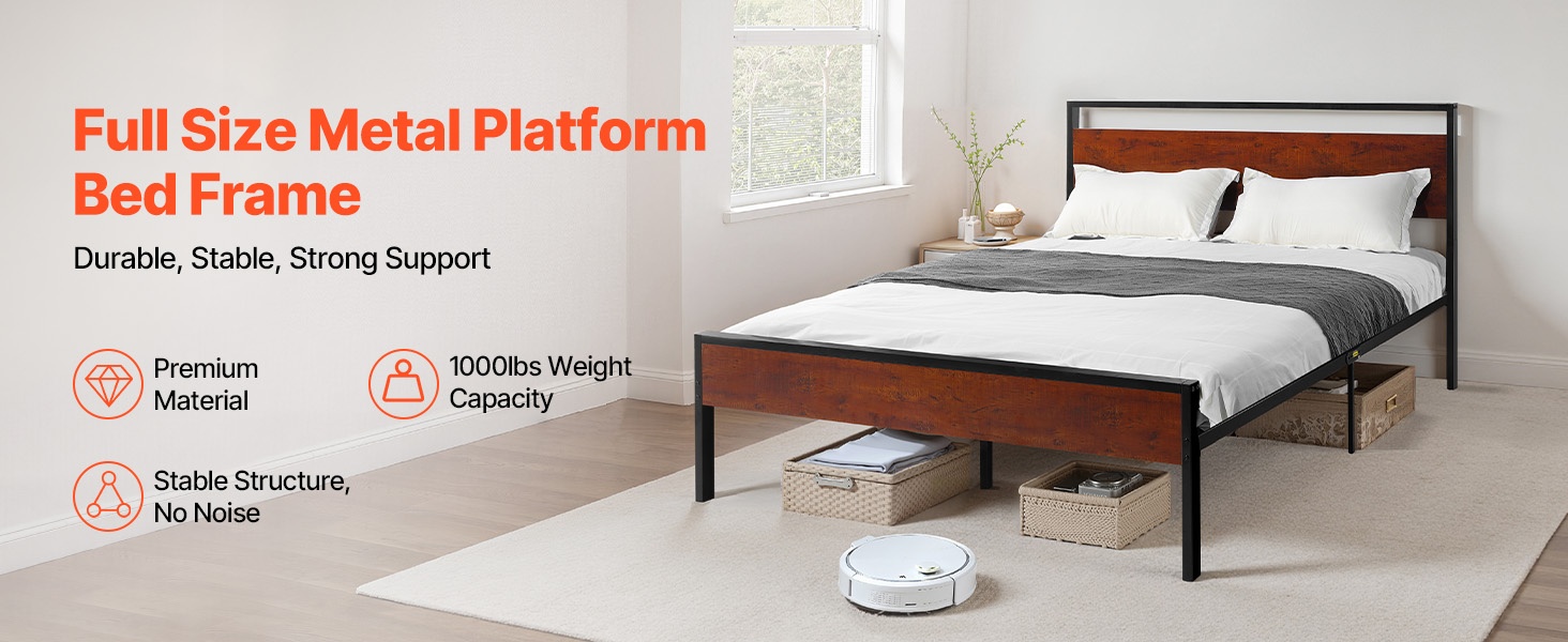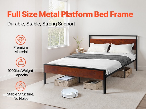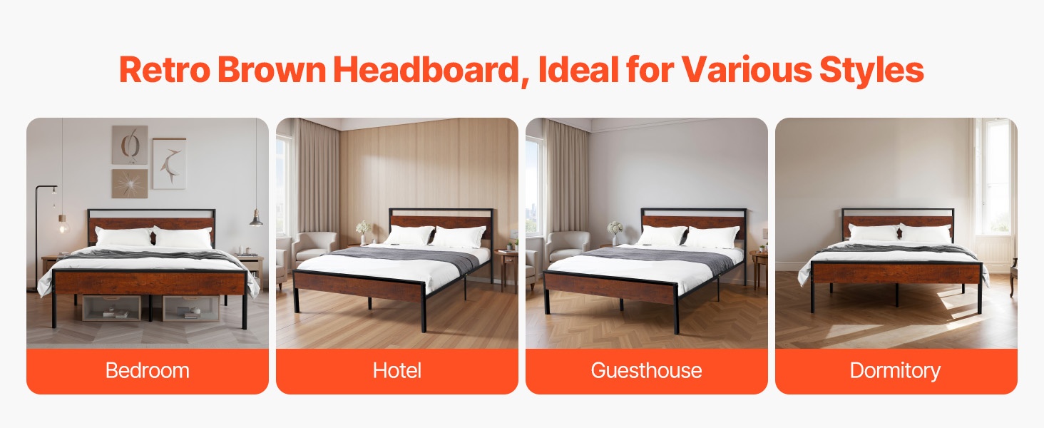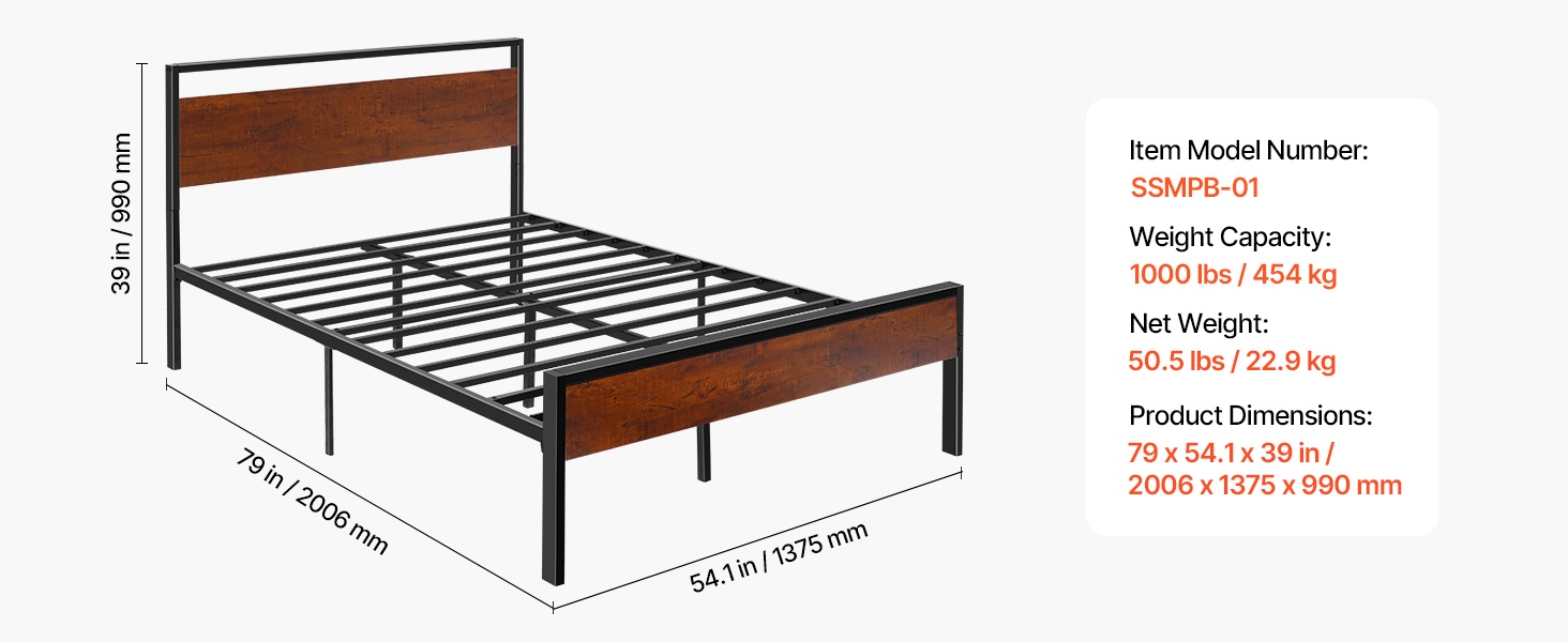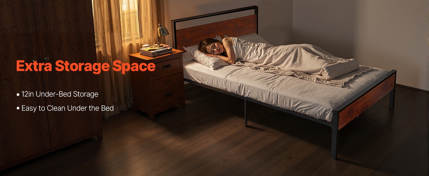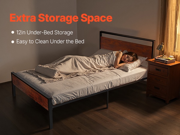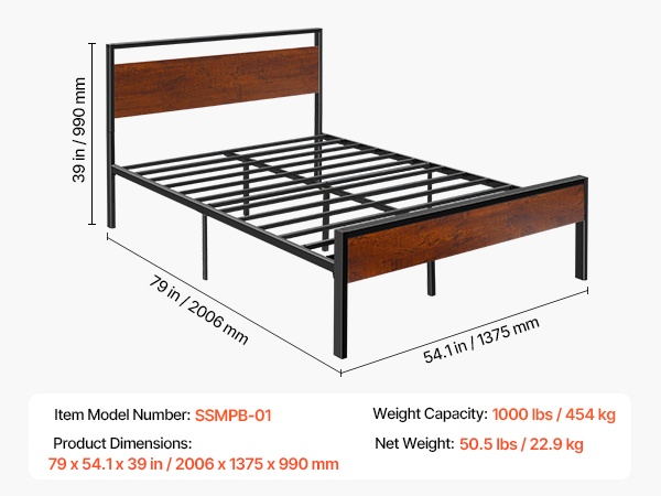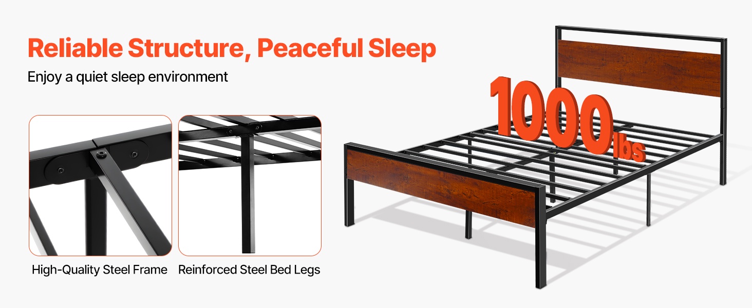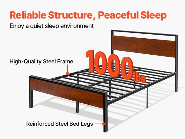 Tukeva metallinen sängyn runko, jossa on retrohenkinen ruskean puun värinen pääty ja jalkopääty. Rungon korkeus on 35 cm, ja 12-tuumainen (noin 30 cm) vapaa tila lattian ja sängyn pohjan välissä tarjoaa runsaasti säilytystilaa sängyn alla. Rakenne on suunniteltu hiljaiseksi ja liukumattomaksi, eikä erillistä joustinpatjaa tarvita. Kokoaminen on helppoa, eikä vaadi erikoistyökaluja.
