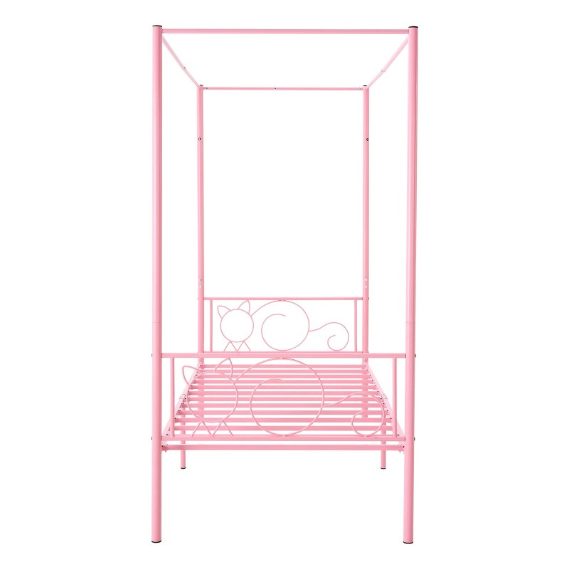 Metallinen yhden hengen katossängyn runko neljän pylvään vaaleanpunainen