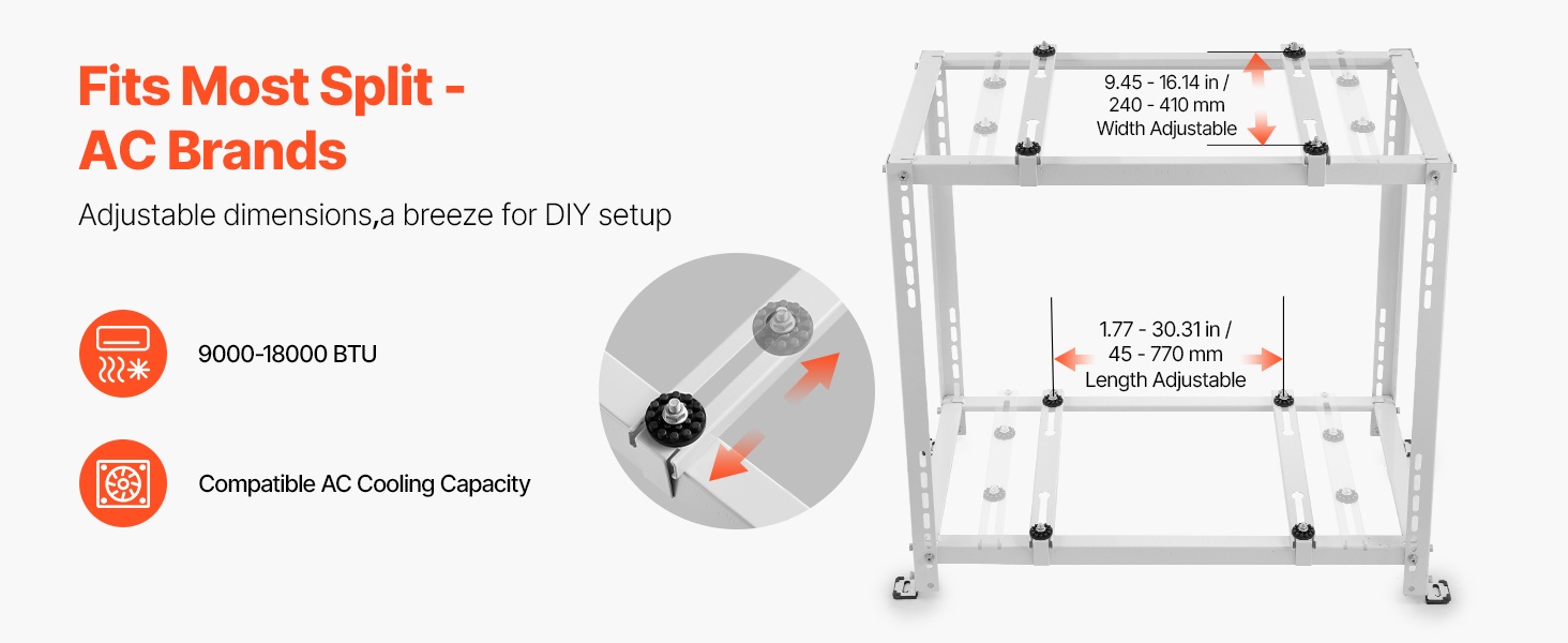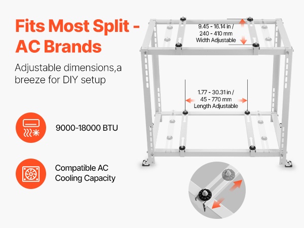 Tämä mini split -lattiateline on yhteensopiva useimpien seinälle asennettavien ilmastointilaitteiden ja lämpöpumppujen ulkoyksiköiden kanssa, joten se sopii eri merkkien ja mallien käyttöön.