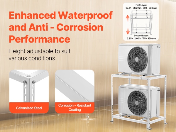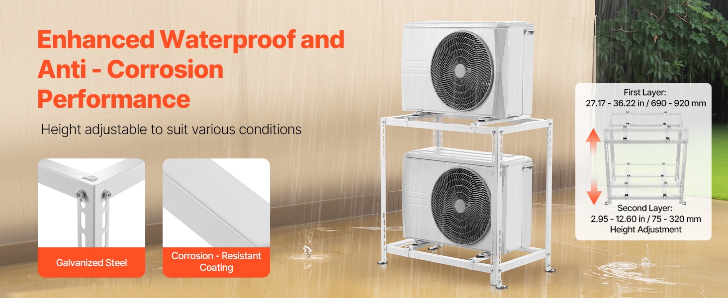 Säätämällä telineen korkeuden sopivaksi ulkoyksikkö pysyy rankkasateiden ja ääriolosuhteiden aikana vedenpinnan yläpuolella, mikä auttaa pidentämään laitteen käyttöikää.