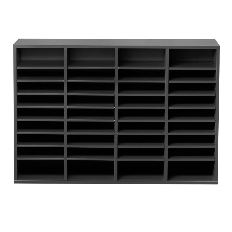 36-lokeroinen monitoimilokero järjestää postin ja asiakirjat helposti; säädettävät hyllyt 25–55 mm, tukeva viilutettu lastulevy/MDF, 10 kg kantavuus per hylly, suojaavat väliseinät pitävät paperit siistinä, sopii toimistoon, kotiin ja luokkaan