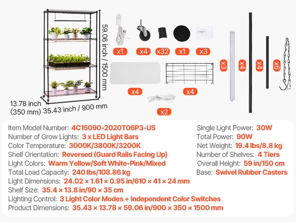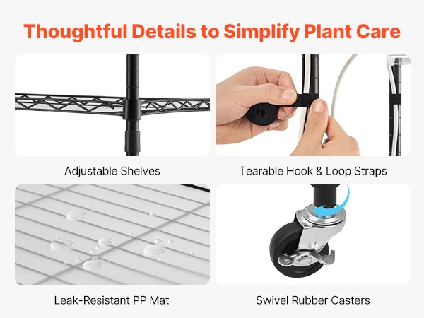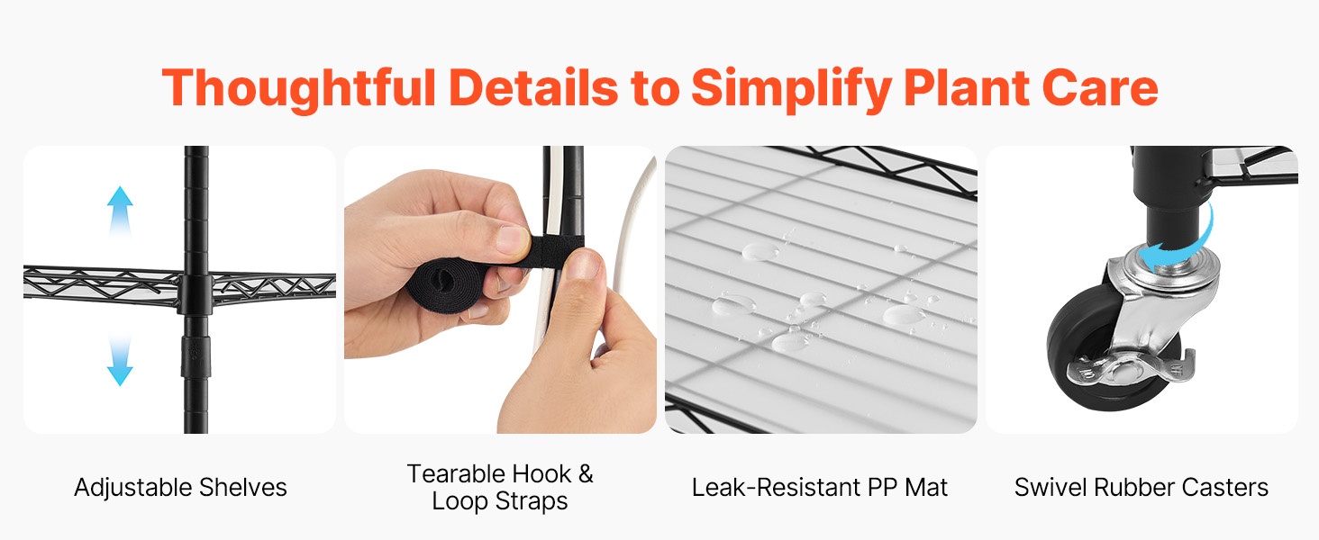 Säätökorkeudella varustetut hyllyt mahdollistavat sekä matalien taimien että korkeampien kasvien sijoittamisen samaan telineeseen. Kiinnityshihnat auttavat pitämään kasvit ja johdot siististi paikoillaan, ja vuotamattomat PP-alustat estävät veden pääsyn sähköosiin. Kääntyvät kumipyörät helpottavat telineen siirtämistä huoneesta toiseen.