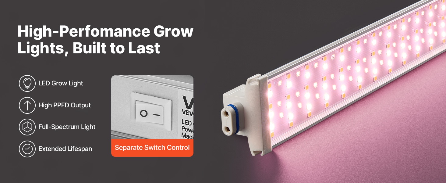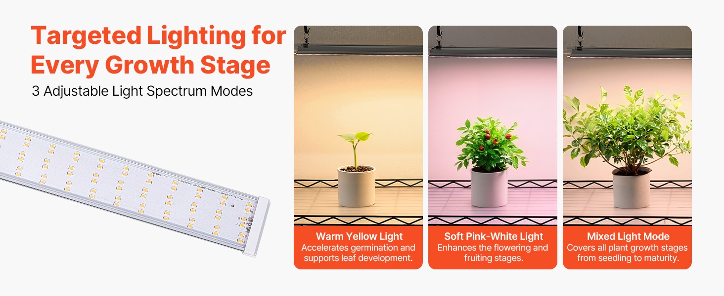 8 kpl korkealaatuisia LED-valopalkkeja jakaa valon tasaisesti jokaiselle tasolle. 5000K täysspektrinen valo jäljittelee luonnonvaloa, tukee fotosynteesiä ja auttaa kasveja kaikissa kasvuvaiheissa, siemenestä sadonkorjuuseen.