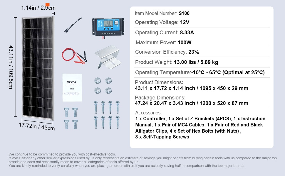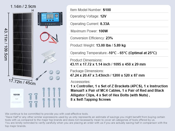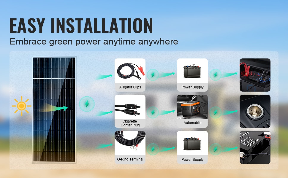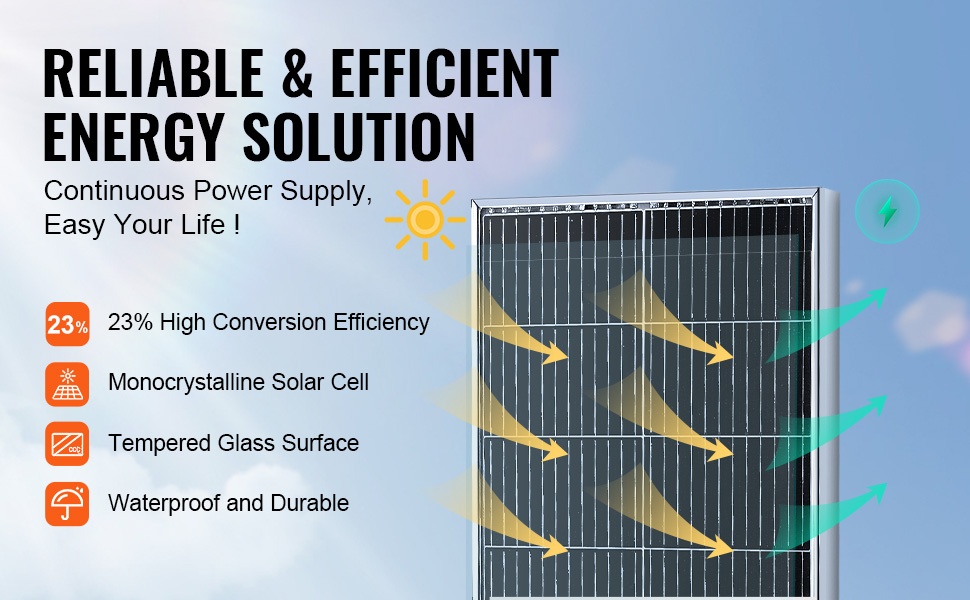 100W monokideaurinkopaneelisarja 12V-järjestelmiin tarjoaa tasaisen virtalähteen kotiin, matkailuautoon, veneeseen ja muihin off-grid-kohteisiin. Korkea 23% muunnostehokkuus ja mukana tuleva lataussäädin auttavat hyödyntämään auringon energian luotettavasti erilaisiin akkuihin (AGM, GEL, FLD, LI).