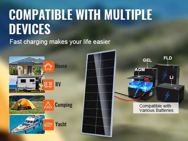 Aurinkopaneeli sopii energianlähteeksi kotiin, mökille, matkailuautoon, veneeseen ja leirintäkäyttöön. Yhteensopivuus AGM-, GEL-, FLD- ja LI-akkujen kanssa helpottaa järjestelmän suunnittelua eri tarpeisiin.