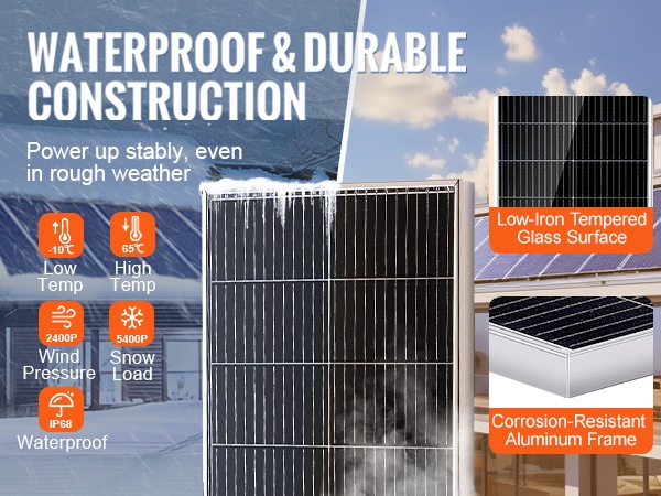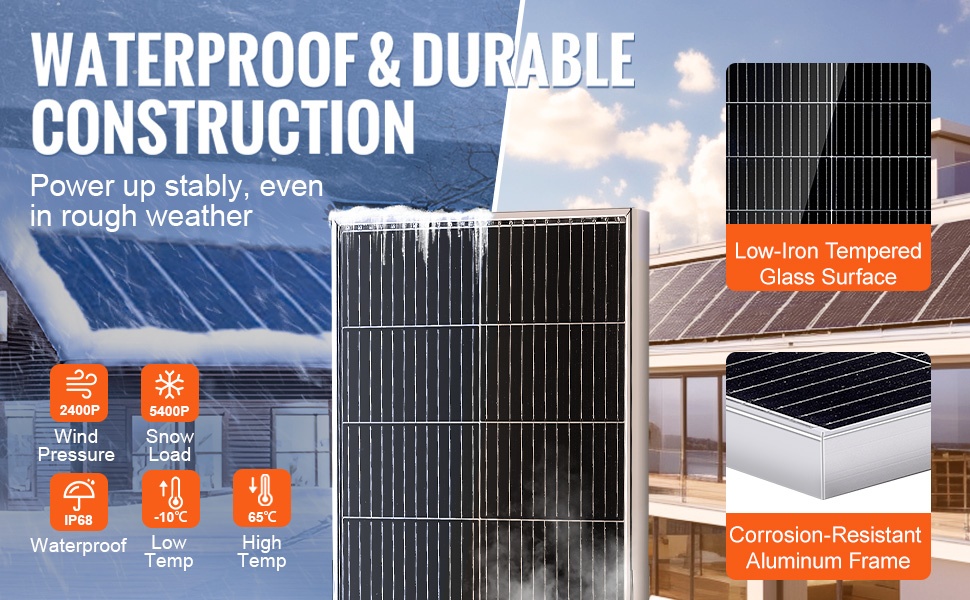 Alhaisen rautapitoisuuden karkaistu lasi ja korroosionkestävä alumiinikehys suojaavat paneelia mekaaniselta rasitukselta ja sääolosuhteilta. IP68-suojaus ja käyttölämpötila-alue -10℃ – 65℃ tekevät paneelista sopivan ympärivuotiseen käyttöön myös vaativassa ilmastossa.