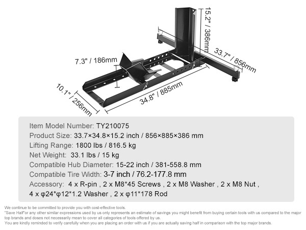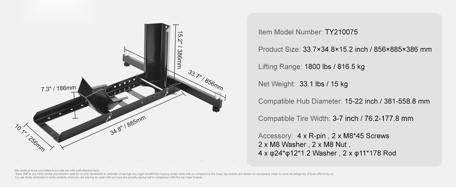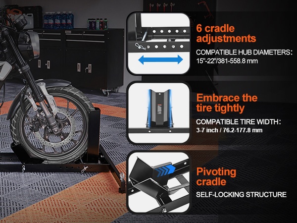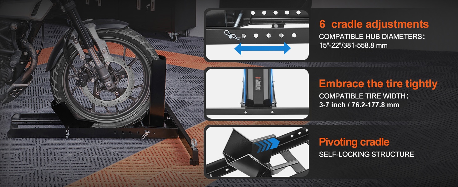 Teline sopii vanteen halkaisijoille 15–22 inch (381–558.8 mm) ja renkaan leveydelle 3–8 inch (76.2–203.2 mm), joten sitä voidaan käyttää monien eri moottoripyörämallien kanssa. Tolpan asentoa säätämällä kiila mukautuu renkaan kokoon ja tukee pyörää tasapainoisesti.