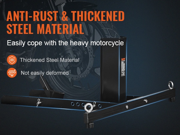 Paksunnettu teräsrunko kestää jopa 1800 lbs kuorman ja mahdollistaa moottoripyörän pitkäaikaisen säilytyksen ilman muodonmuutoksia. Rakenne on suunniteltu kestämään ruostetta ja korroosiota, mikä pidentää käyttöikää vaativissakin olosuhteissa.