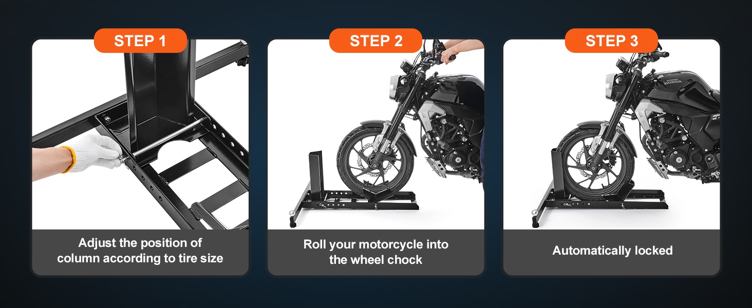 Käyttö ei vaadi monimutkaisia lisätoimenpiteitä: säädä vain tolpan paikka vastaamaan renkaan halkaisijaa ja työnnä moottoripyörä telineeseen. Bracketti lukittuu automaattisesti ja vakauttaa pyörän, mikä helpottaa pysäköintiä, huoltoa ja kuljetusta.