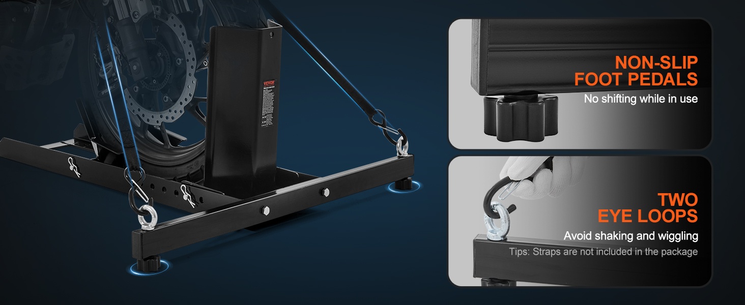 Moottoripyörän etu- tai takapyörän kiila on monikäyttöinen ja kestävä teline, joka pitää eri kokoiset moottoripyörät tukevasti paikallaan. Säädettävän rakenteen, liukumattomien ominaisuuksien ja vahvan teräsrungon ansiosta pyörä pysyy vakaasti pystyssä ja vahinkojen riski pienenee. Sopii hyvin käytettäväksi autotallissa, korjaamolla, trailerissa ja kuorma-autossa.