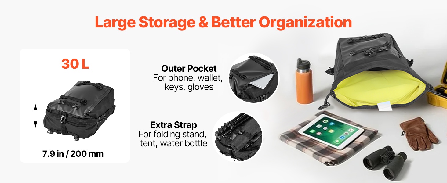 Vedenpitävä suojus ja roiskeita hylkivä, kulutusta kestävä kangas auttavat suojaamaan sisältöä sateelta ja tien roiskeilta. Sileä vetoketju on helppokäyttöinen myös käsineet kädessä, mikä parantaa käyttömukavuutta.
