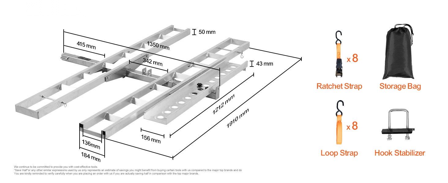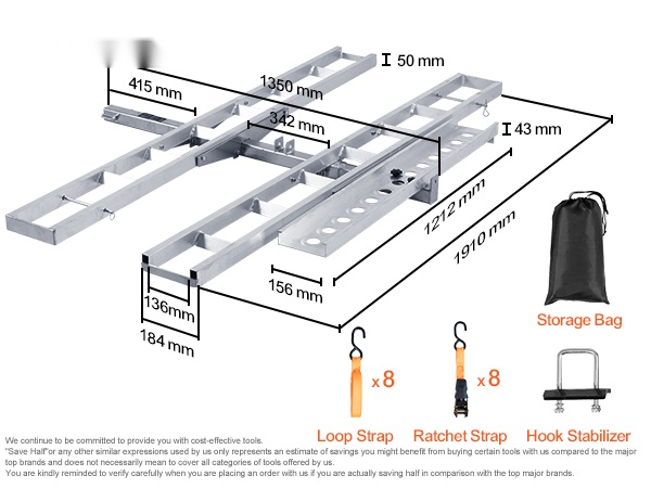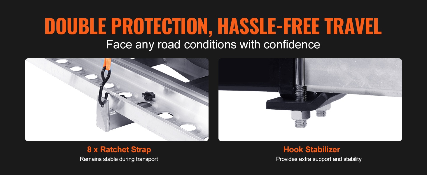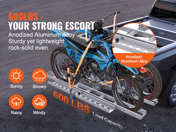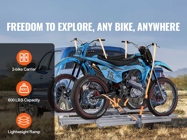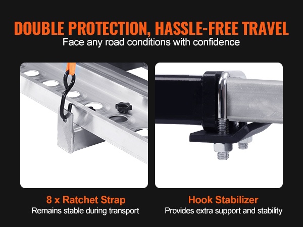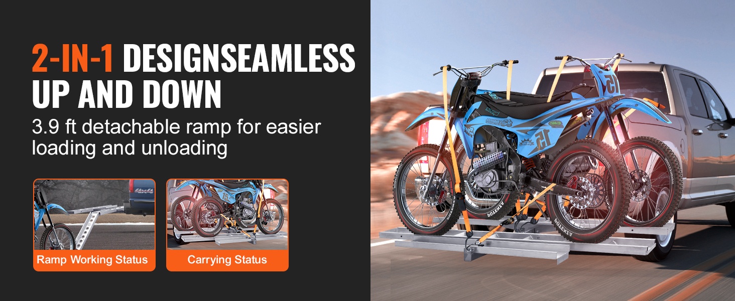 Itsesäilyttävä ramppi helpottaa lastausta ja purkua, ja mukana tulevat kiristysliinat sekä stabilointiosat vähentävät heilumista ajon aikana. Teline sopii ajoneuvoihin, joissa on 2-tuumainen / 5.1 cm vetokoukun vastaanotin.